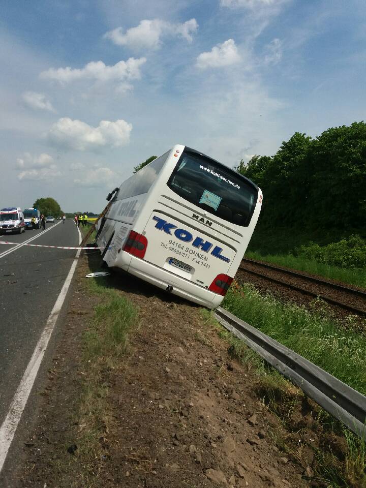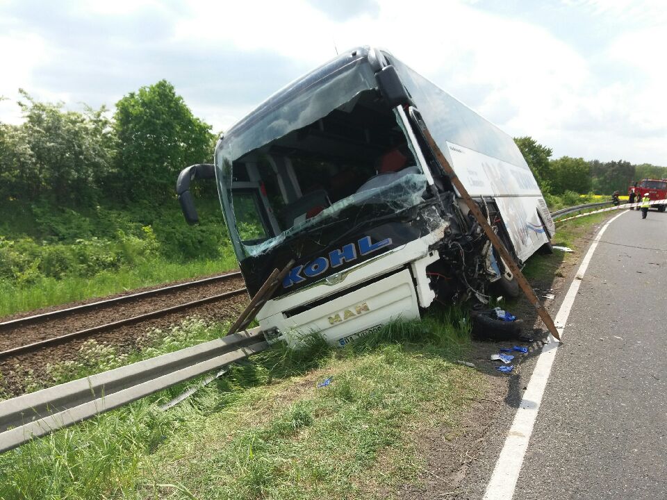 Wypadek przy przejeździe kolejowym w Żabowie niedaleko Nowogardu wyglądał groźnie, ale na szczęście nie ucierpieli w nim podróżujący autokarem niemieccy turyści.