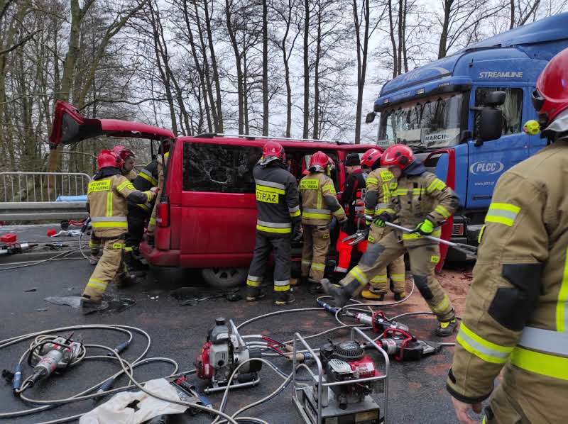 Jednocześnie trwają działania związane z uwolnieniem 5 osób zakleszczonych w volkswagenie. Ratownicy udzielają pomocy osobom poszkodowanym. Na miejscu pracują służby.