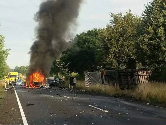 W miejscowości zderzyły się trzy pojazdy: ciężarówka, bus oraz samochód osobowy. To ostatnie auto stanęło w płomieniach.