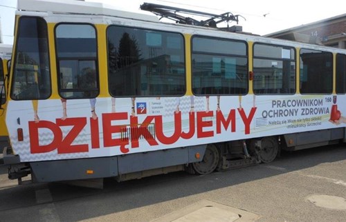 Tramwaj z wyklejoną podziękowaniami burtą wyjechał z zajezdni Pogodno na trasę linii 1. Niewykluczone, że w najbliższych dniach będzie go można spotkać także na innych trasach. Jak podkreśla Hanna Pieczyńska, rzeczniczka prasowa spółki Tramwaje Szczecińskie, napisy na pojeździe (to jedna z przegubowych tatr) są podziękowaniem za poświęcenie i trud wkładany w ratowanie życia i zdrowia ludzi w tym wyjątkowo trudnym czasie.