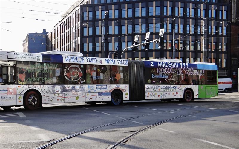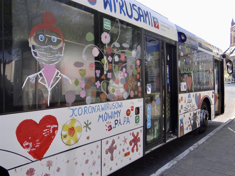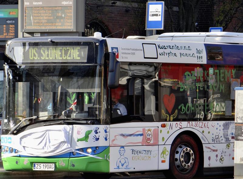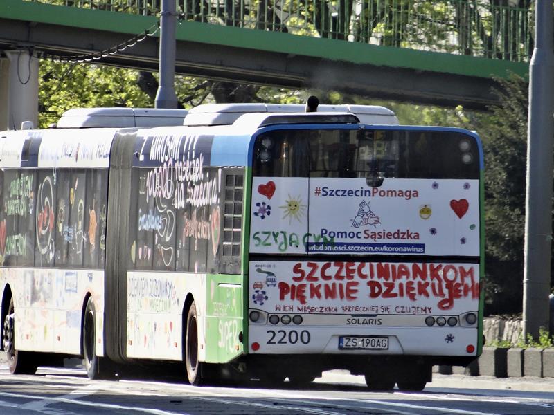 Do autobusu z maseczką i wymalowanymi przez pracowników Szczecińskiego Przedsiębiorstwa Autobusowego Dąbie podziękowaniami dla szczecinianek szyjących maseczki i mającym napawać wszystkich optymizmem w czasie pandemii koronawirusa, dołączył w czwartek (30 kwietnia) może mniej barwny, ale także z przesłaniem w geście podziękowań tramwaj. Wyjeżdżać teraz będzie systematycznie przez dwa miesiące z zajezdni Pogodno oklejony napisami w dowód wdzięczności pracowników miejskich jednostek i mieszkańców za ciężką pracę lekarzy, pielęgniarek, ratowników i pozostałych przedstawicieli ochrony zdrowia.