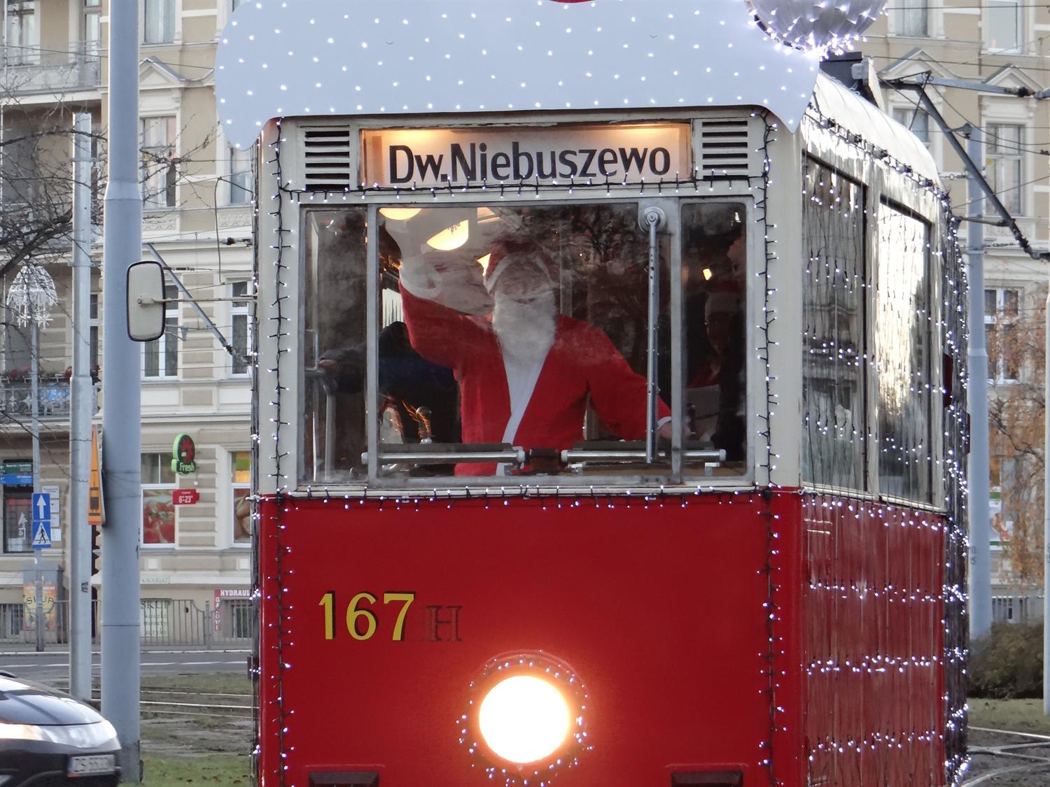 W piątek (23 grudnia) w trasę objazdową po Szczecinie rusza znów świąteczny tramwaj. Początek przygody na torach z najstarszym składem odrestaurowanej N-ki, przystrojonej odświętnie girlandami lampek, czapką Mikołaja i z Mikołajem motorniczym jak w każdy grudniowy piątek od ok. godz. 16.20 po wyjeździe z zajezdni Pogodno z przystanku przy pl. Szarych Szeregów. Nieodpłatne przejażdżki wagonem z lat 50. minionego wieku między Niebuszewem i Pomorzanami do godz. 20. ©℗
