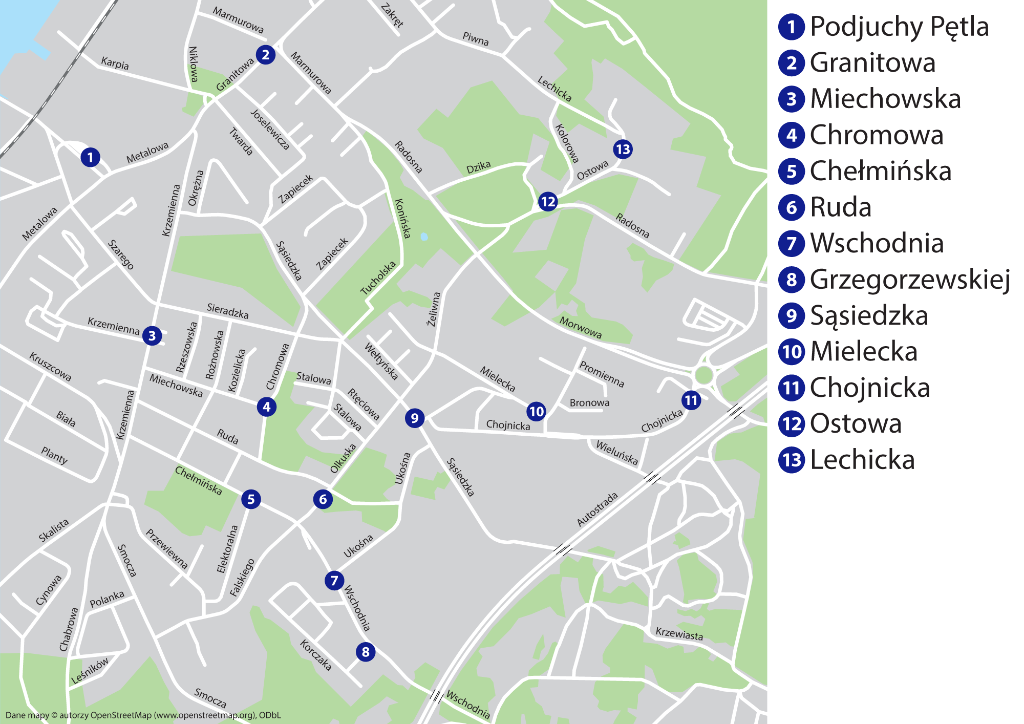 Po rozmowach z Radą Osiedla wytypowano kilkanaście miejsc, z których odjeżdża Bus na telefon - Pętla Podjuchy, Granitowa, Miechowska, Chromowa, Chełmińska, Ruda, Wschodnia, Grzegorzewskiej, Sąsiedzka, Mielecka, Chojnicka, Ostowa, Lechicka.