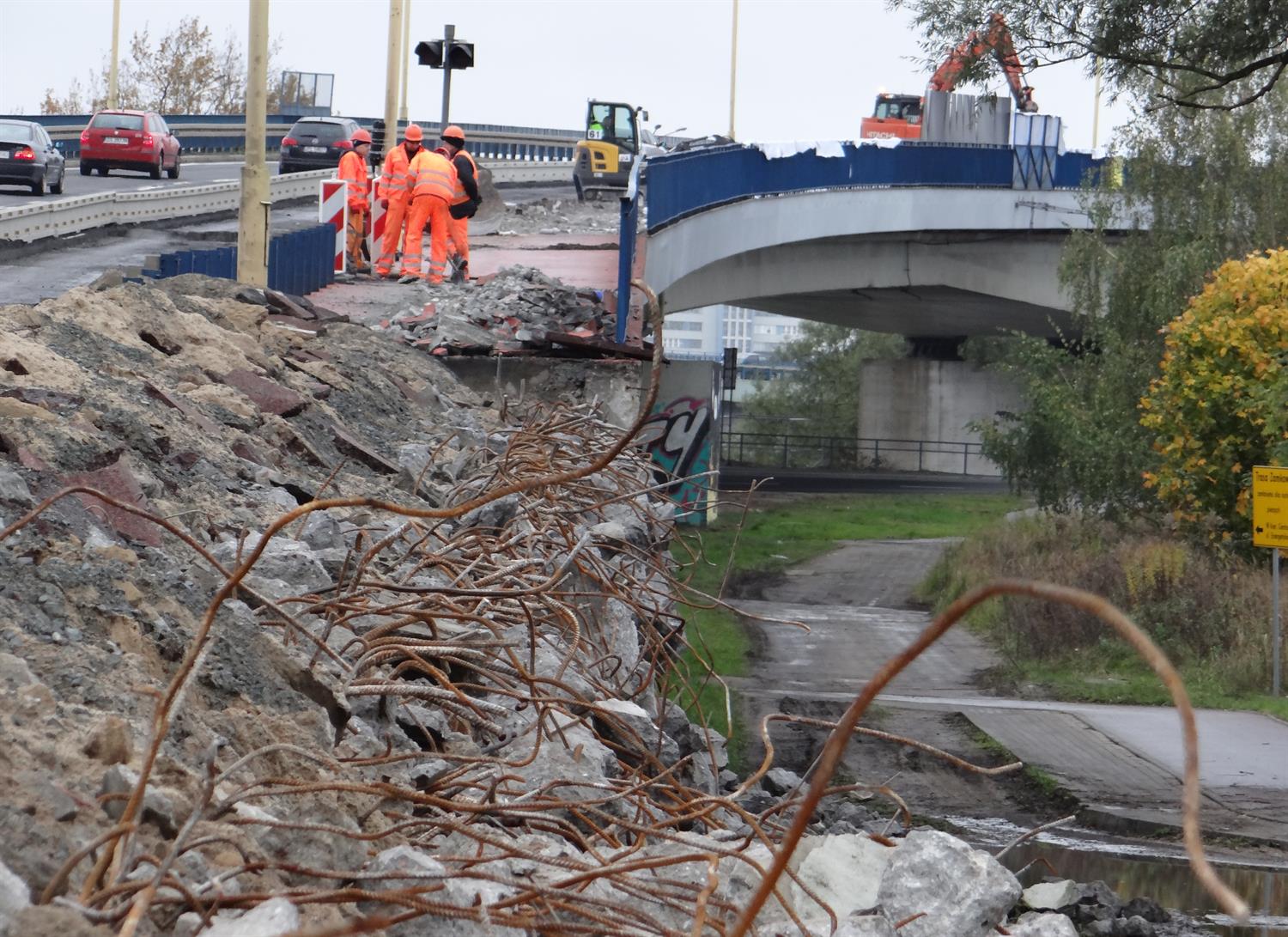 W hałdy gruzu zamienił się w pierwszej kolejności fragment dojazdu na tej szerokości do estakady od ul. Gdańskiej. Mimo wcześniejszych zapowiedzi o planowanej blokadzie także zjazdu z trasy łącznicą do ul. Jana z Kolna po zakończeniu remontu na ul. Emilii Sczanickiej, kierowcy na razie mogą nadal korzystać z prawoskrętu, który do niej prowadzi.