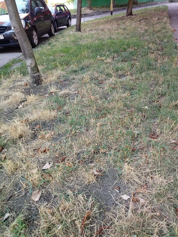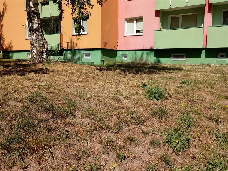 To samo jest na Bazarowej 2-8. Koszą tu trawę raz, może dwa razy w miesiącu, przez co w czasie upałów nie nadąża ona odrosnąć i usycha.