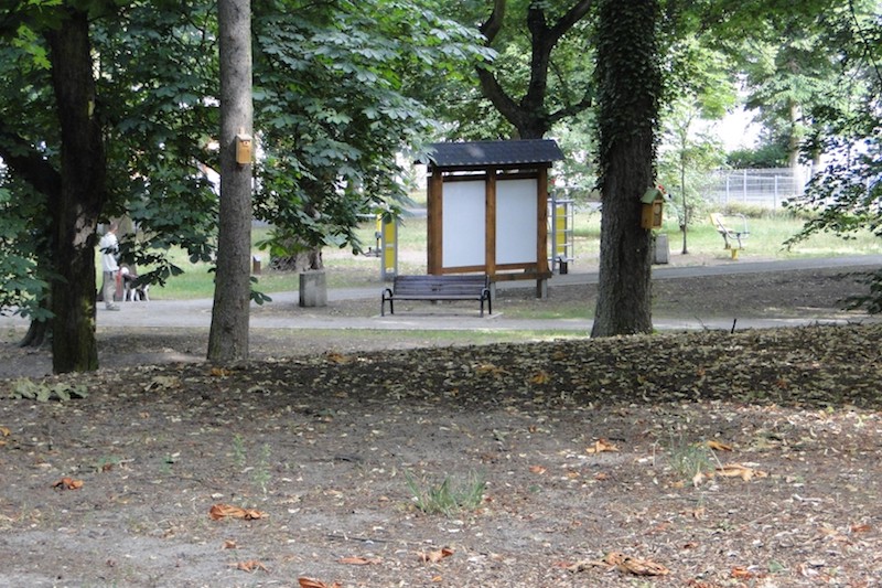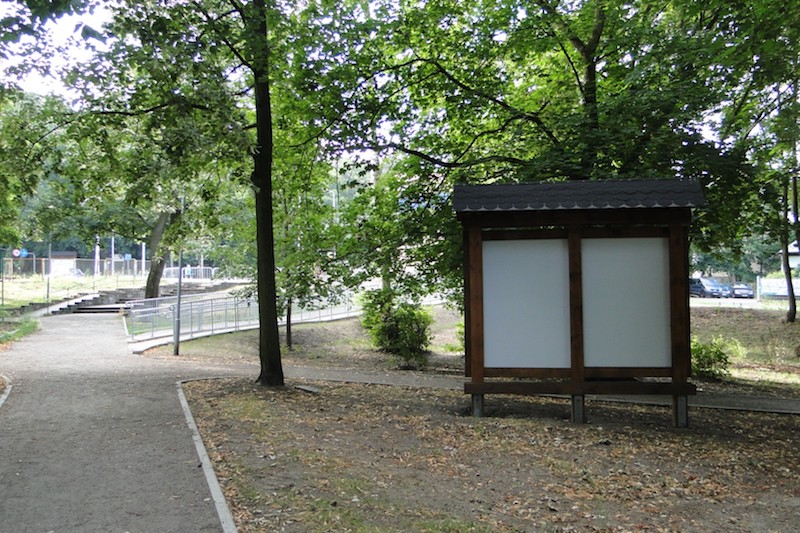 Niestety, w dalszej wędrówce parkowymi ścieżkami panowie mijali kolejne okazałe „tablice informacyjne”, które widziane z miejsc pokonywanej przez nich trasy o niczym nie informowały.