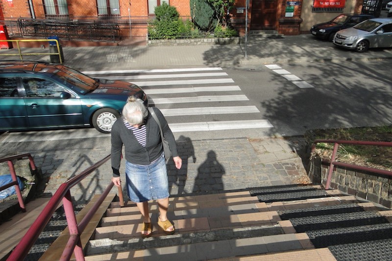 - Zejście lub wejście po tych sfatygowanych schodach jest bardzo niebezpieczne – powiedziała pani Elżbieta korzystająca z przejścia w chwili fotografowania obiektu. – Dzisiaj mam buty na koturnie, które mają solidną podstawę, a i tak schodzę ostrożnie. Ale już nawet niewielkim obcasikiem można zawadzić o uszkodzone stopnie i nieszczęście gotowe.