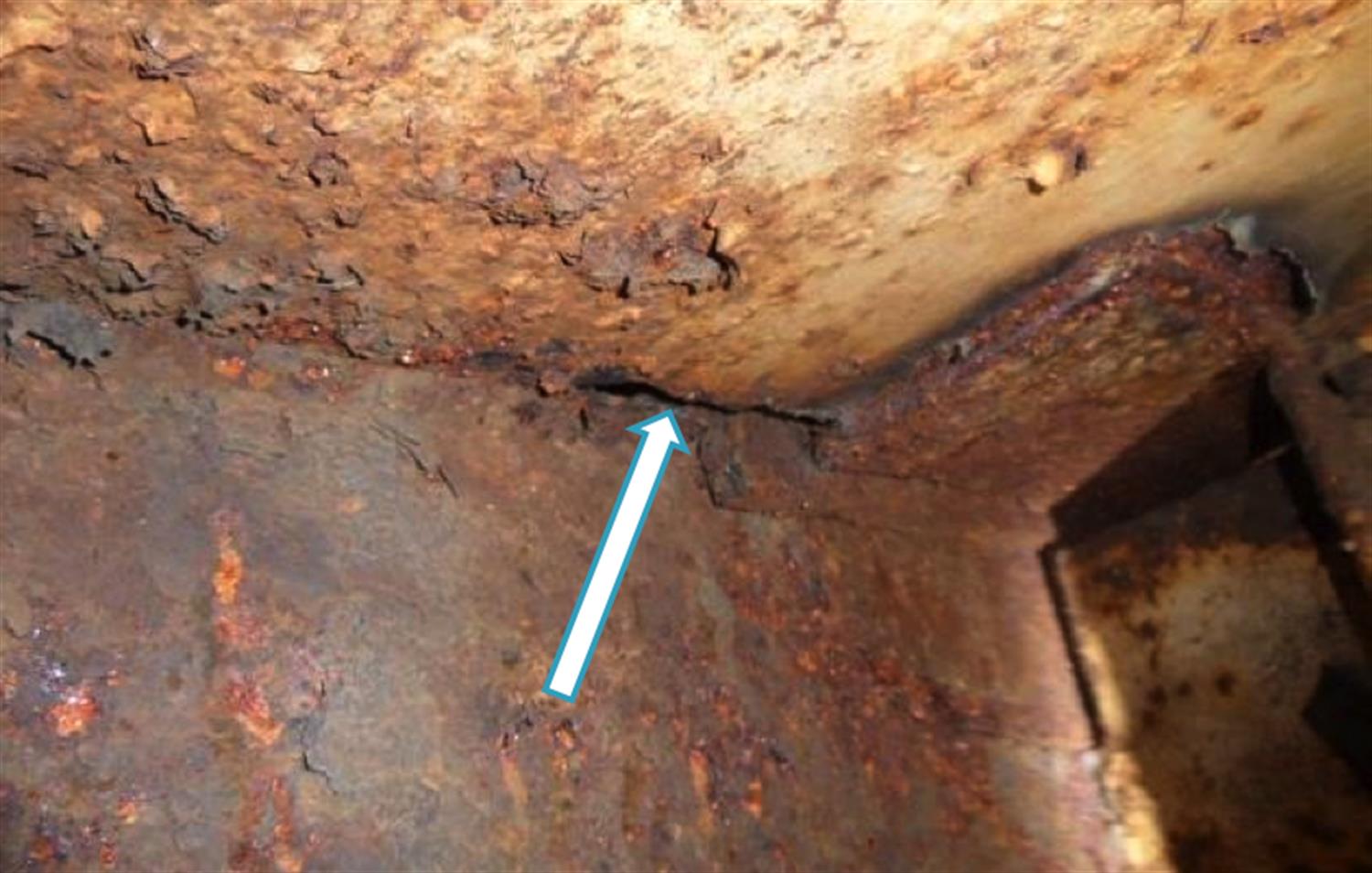 Na zdjęciu: Nieszczelności w górnej części kanału wentylacyjnego klimatyzacji na spawanych połączeniach blach w szybie wentylacyjnym ładowni