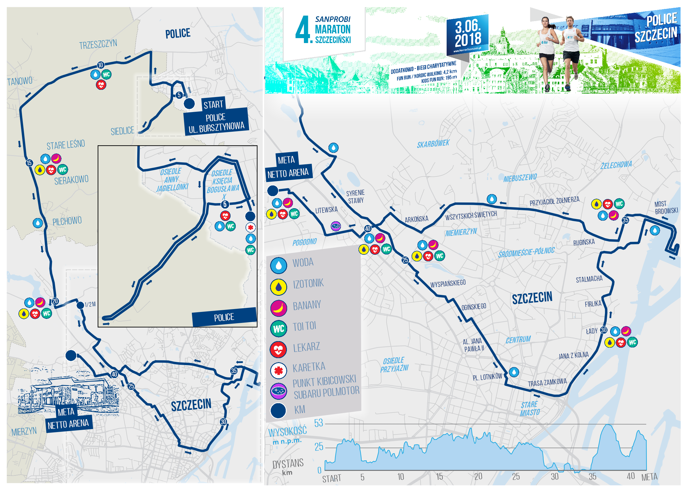 Od ul. Tanowskiej w Policach do granic Szczecina trasa maratonu wiedzie drogą dla rowerów terenami zielonymi do Teatr Letniego i następnie ul. Wyspiańskiego do ul. Piotra Skargi. Możliwe utrudnienia na liniach 51 (ul. Miodowa), 80 (ul. Arkońska przy ul. Międzyparkowej), 53 i 60 (ul. Zaleskiego – wstrzymanie ruchu lub przekierowanie przez ul. Piotra Skargi), 67 (ul. Piotra Skargi – skierowanie w ul. Zaleskiego i Słowackiego).