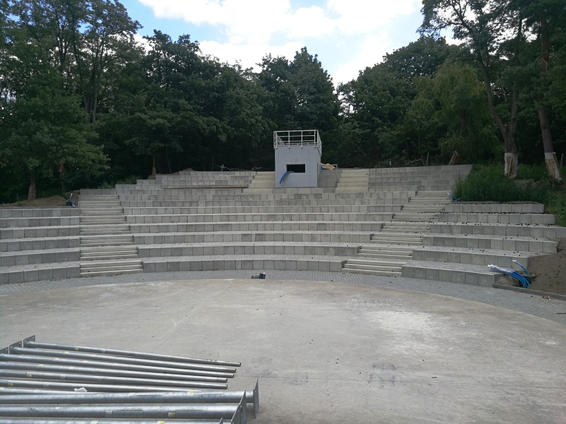 Pod ekranem znajduje się podscenium. W pomieszczeniach trwają prace wykończeniowe. Ponadto niwelowane i kształtowane są skarby, montowane jest również zewnętrzne oświetlenie. Do amfiteatru doprowadzona została bowiem instalacja elektryczna. Przy obiekcie wybudowano miejsca parkingowe. Pojawią się też nowe nasadzenia.