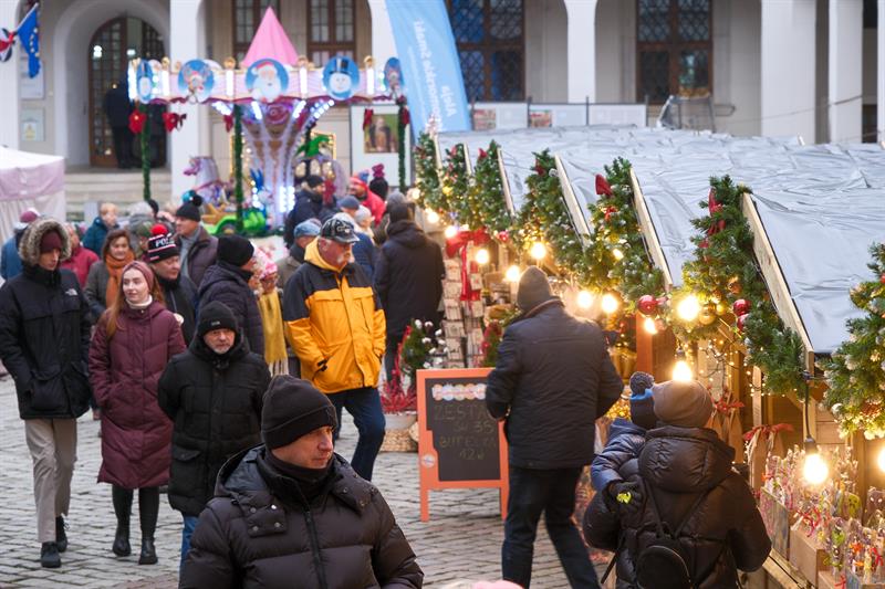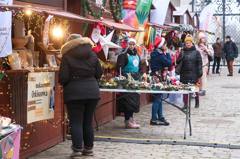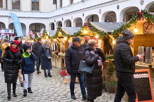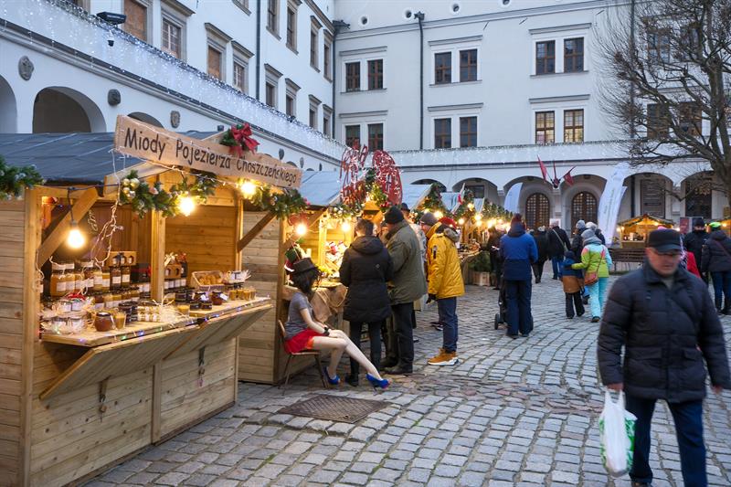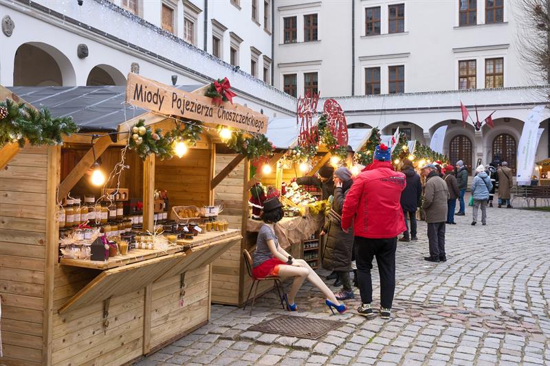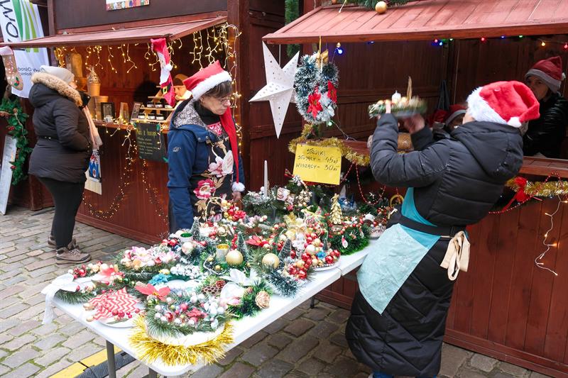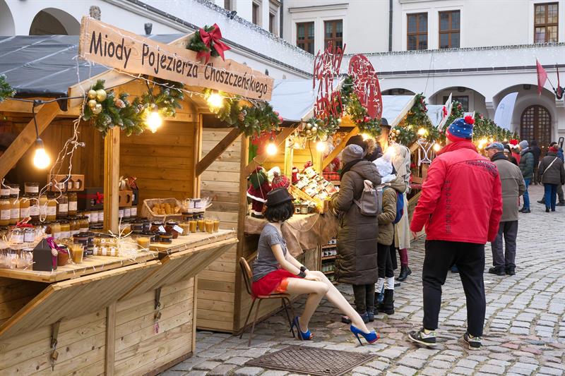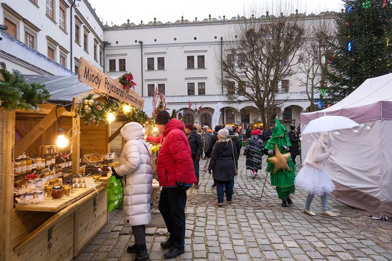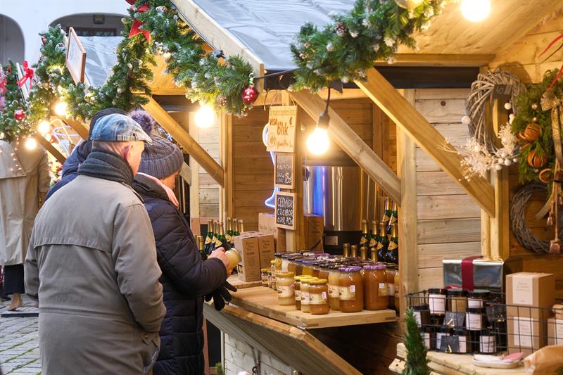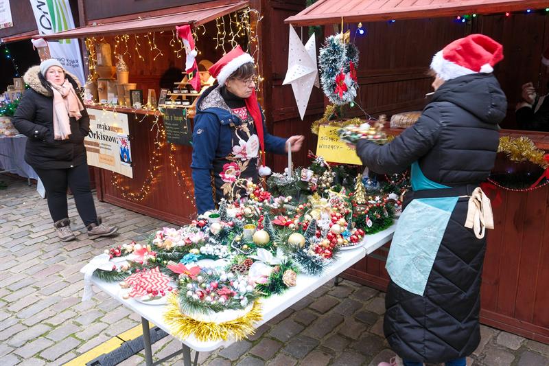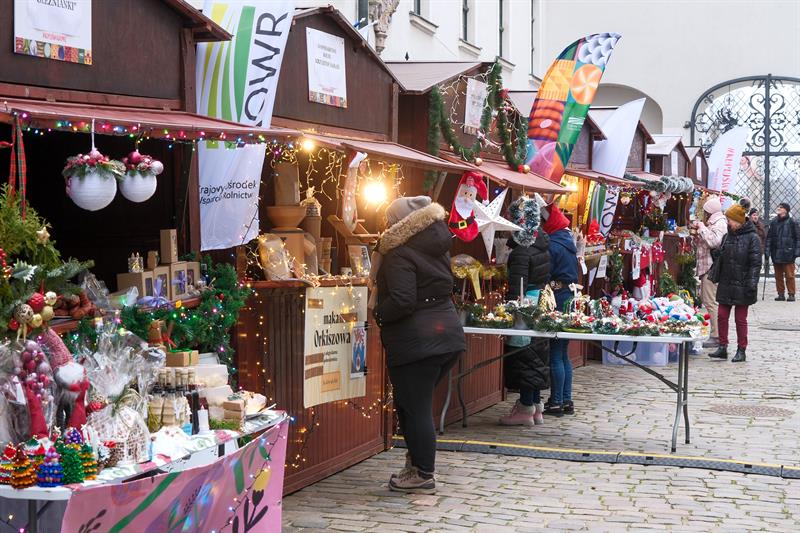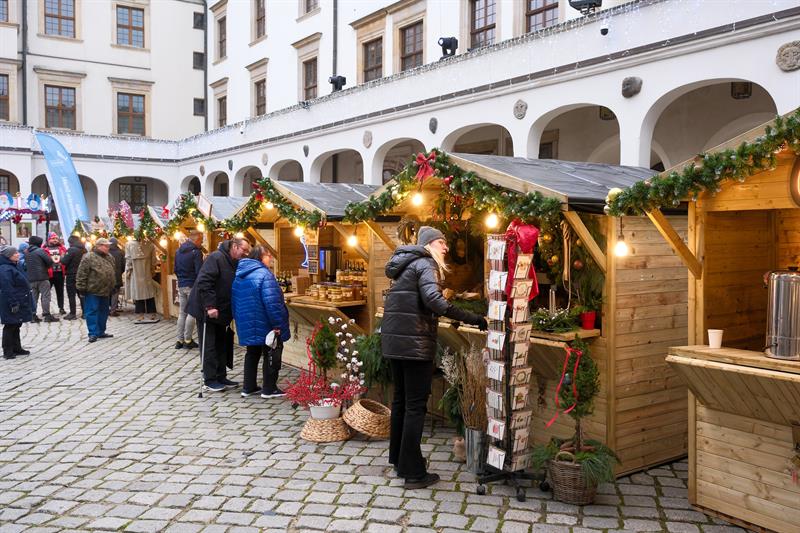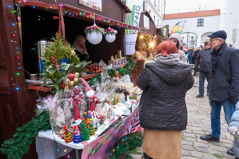 Na zamkowych dziedzińcach ustawiono drewniane stoiska, gdzie są prezentowane produkty lokalnych rzemieślników oraz regionalne przysmaki. W powietrzu unosi się aromat pierników i grzanego wina, zachęcając do degustacji. Ręcznie wykonane ozdoby choinkowe, wełniane szale czy ceramika artystyczna cieszą się dużym zainteresowaniem.
