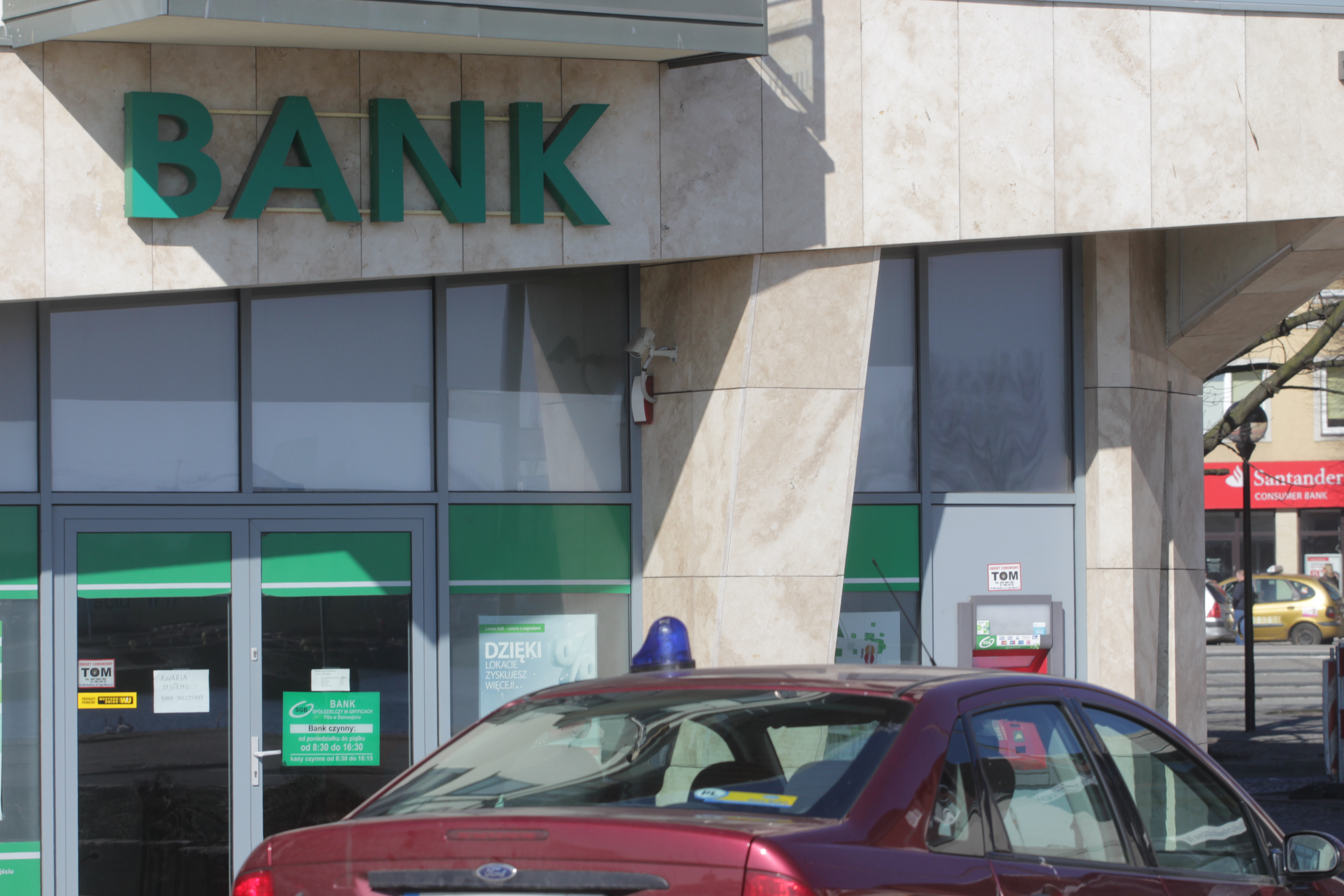 Oddział banku został zamknięty. Na drzwiach wejściowych pracownicy powiesili karteczkę „awaria systemu”. Wewnątrz pracowali policjanci. W poszukiwaniach złodzieja bierze udział także pies tropiący.