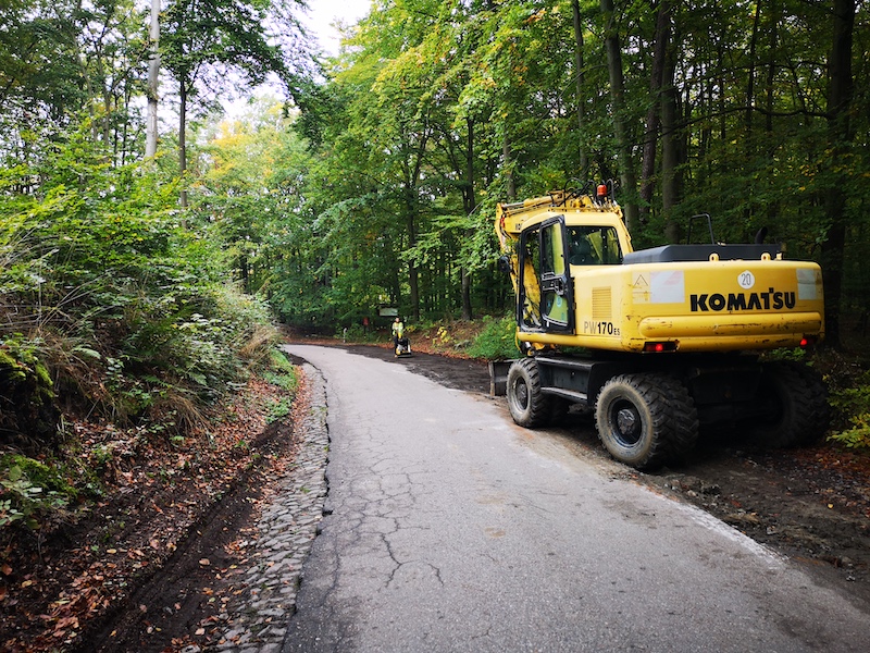 Obecnie trwają roboty związane z poszerzeniem kilkusetmetrowego podmytego pobocza, które było już bardzo zniszczone. Na najbardziej zapadnięte odcinki nawożona jest mieszanina starego asfaltu z lepiszczem, która zostanie ubita przez walce. Założenia są takie, by naprawić drogę aż do pola golfowego w Binowie.