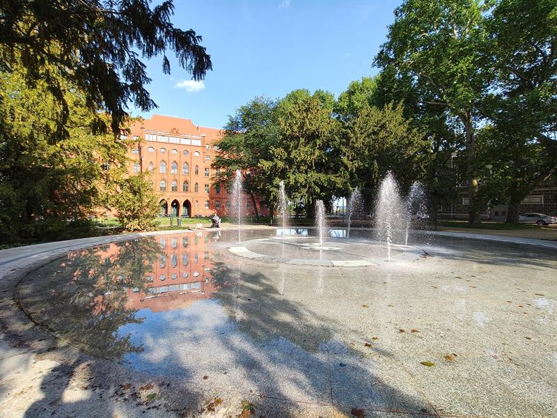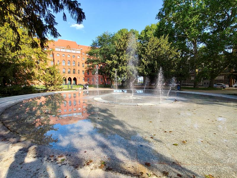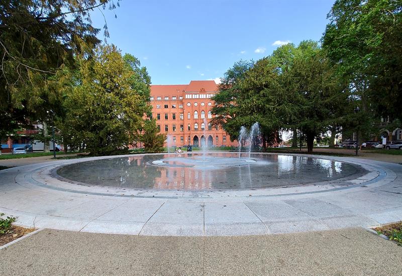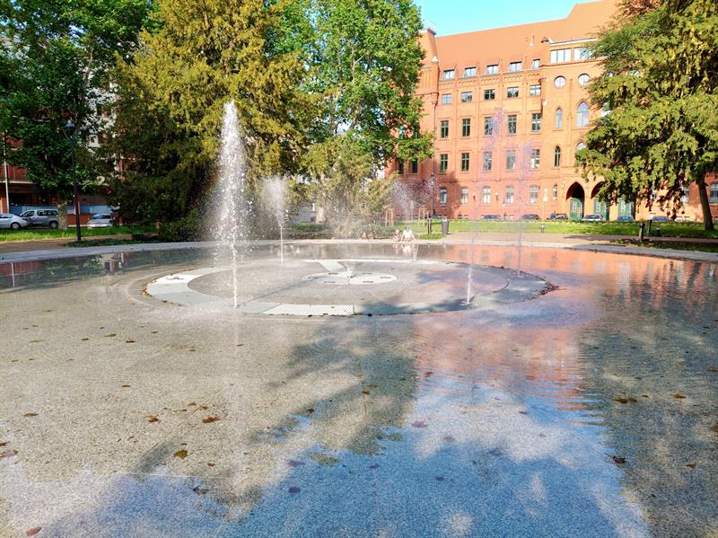 Jego centralnym puntem jest fontanna na obrysie koła – największa, a zarazem najpłytsza w Szczecinie: o średnicy 21 metrów, tafli o głębokości sięgającej zaledwie 6 cm, z której wodne pióropusze mogą strzelać na wysokość nawet 9 metrów. Niestety, jedna z dysz – uruchomionego przed niespełna miesiącem (12 maja) – wodotrysku nie działa.