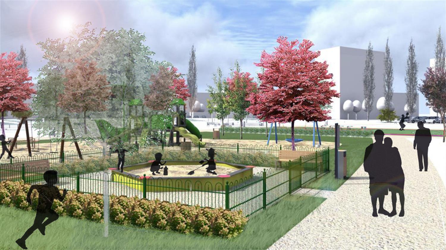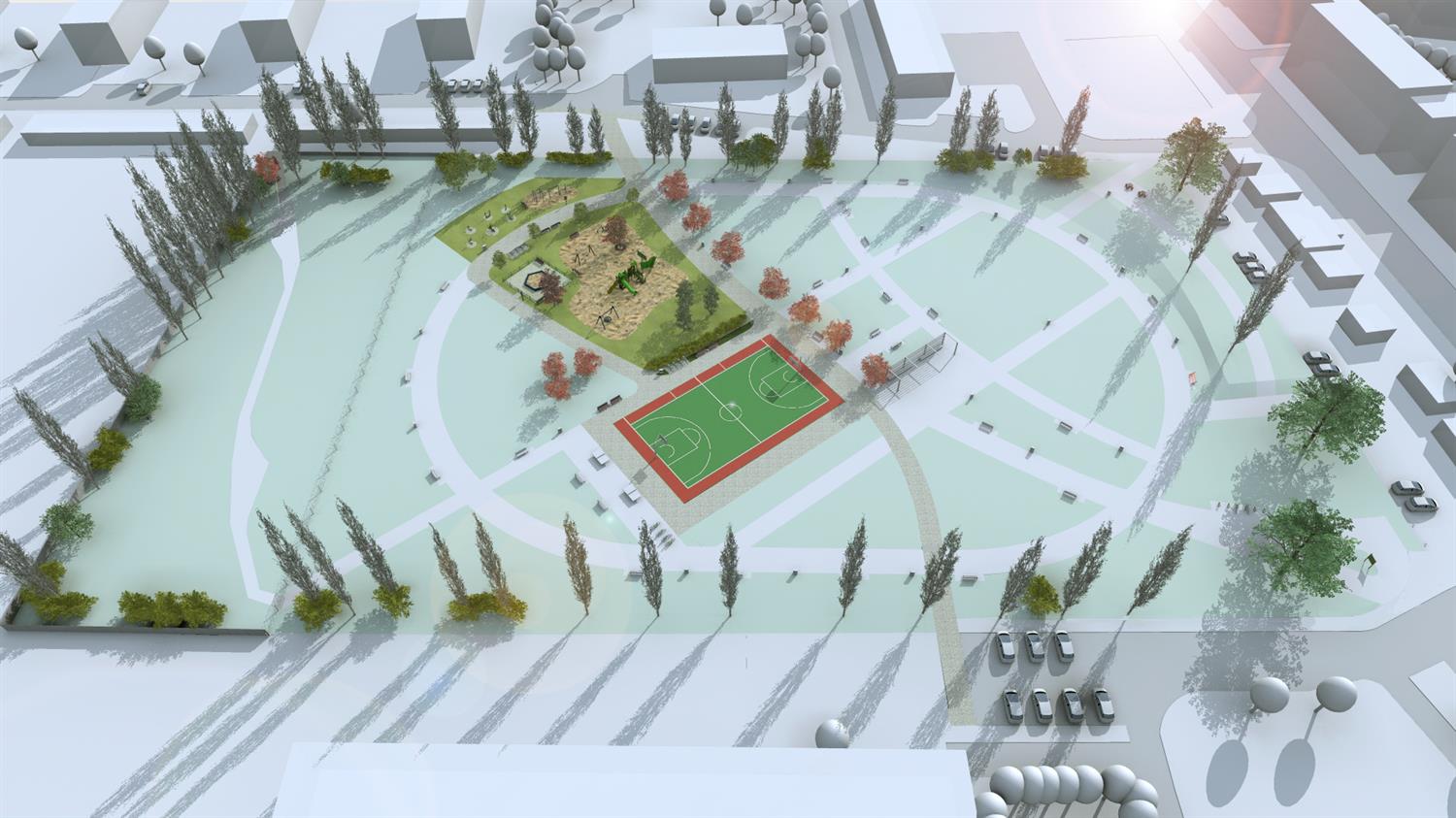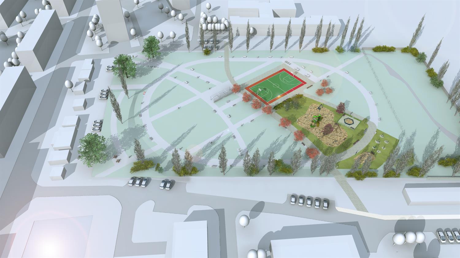 Zwycięzca najpierw ma rozebrać i zutylizować istniejące nawierzchnie, obiekty kubaturowe, słupy itp. Później wykona m.in. nowe uzbrojenie podziemne, ciągi komunikacyjne, chodniki zewnętrzne, boisko sportowe z wyposażeniem, oświetlenie terenu, plac zabaw z wyposażeniem i ogrodzeniem oraz siłownię. Zamontuje stoły do gry w szachy i w ping-ponga. W zakres prac wchodzi też wykonanie chodników i trawników, nasadzenia zieleni, postawienie koszy na śmieci i ławek.