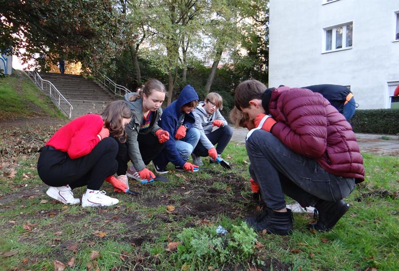 Pierwsze cebulki tulipanów już w ziemi. Najbliższej wiosny zakwitną na niewielkim pasie trawnika między sklepem i dojazdem do garaży przed budynkami przy ul. Franciszka Ksawerego Druckiego-Lubeckiego. Akcję ich sadzenia na terenach zielonych szczecińskiego Drzetowa-Grabowa zainaugurowali tam w poniedziałek uczniowie Społecznej Szkoły Podstawowej im. Noblistów Polskich Społecznego Towarzystwa Oświatowego przy ul. Tomaszowskiej 1 wraz ze swoimi opiekunami oraz mieszkańcami osiedla, jego radnymi i społecznikami ze Stowarzyszenia Lepszy Szczecin. To początek realizacji pomysłu pn. Kolorowe Osiedle.