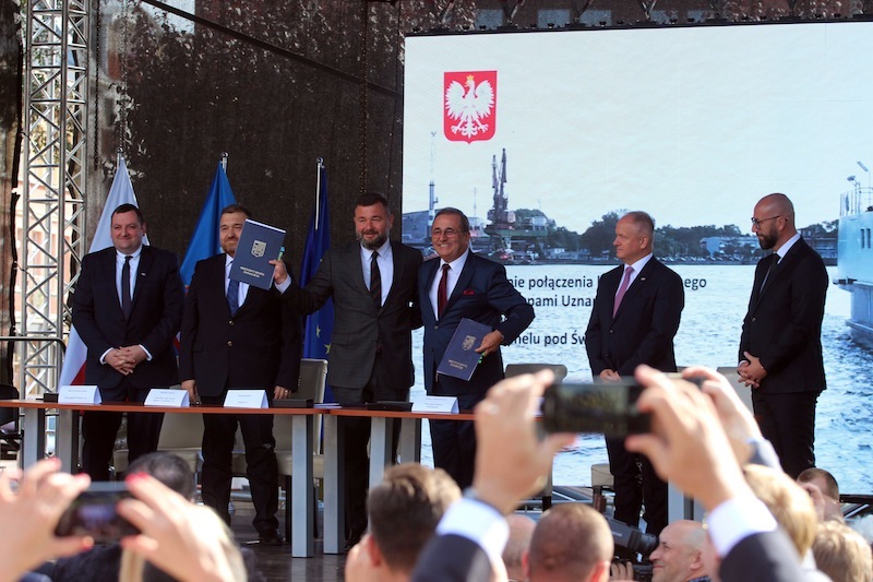 Po przeszło godzinie przemówień doszło do podpisania umowy. Stosowne podpisy pod dokumentami składali Janusz Żmurkiewicz oraz przedstawiciele film, które tunel będą budować, a po nich przedstawiciele firm nadzorujących inwestycję. Stałą przeprawę ma wybudować konsorcjum firm Porr SA (lider konsorcjum), Porr Bau GmbH (Austria), Gülermak Agir Sanayi Insaat ve Taahhüt AS (Turcja) oraz Energopol Szczecin SA. Inżynierem Kontraktu jest konsorcjum Sweco Consulting z Poznania (lider konsorcjum), Sweco GmbH z Bremy i Lafrentz Polska z Poznania. Koszt inwestycji to 793 mln złotych ze środków unijnych oraz budżetu Miasta Świnoujście.