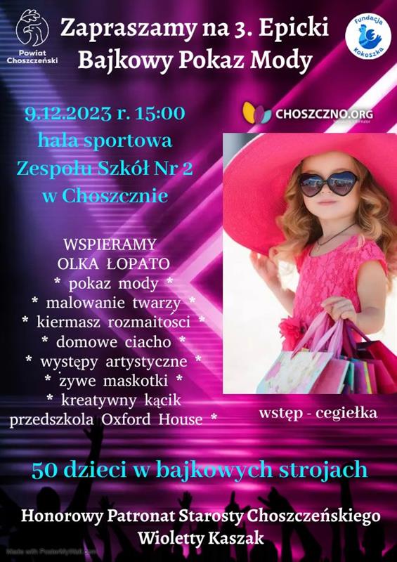 W sobotę, 9 grudnia, w hali sportowej Zespołu Szkół nr 2 przy ul. Polnej 5 w Choszcznie odbędzie się Epicki Bajkowy Pokaz Mody. Impreza rozpocznie się o godz. 15. Wstęp za symboliczną cegiełkę.