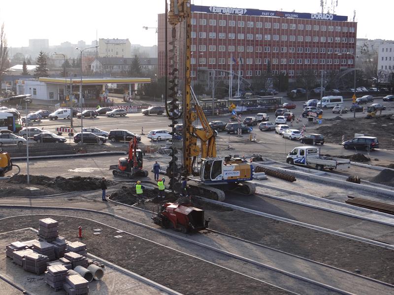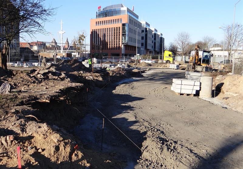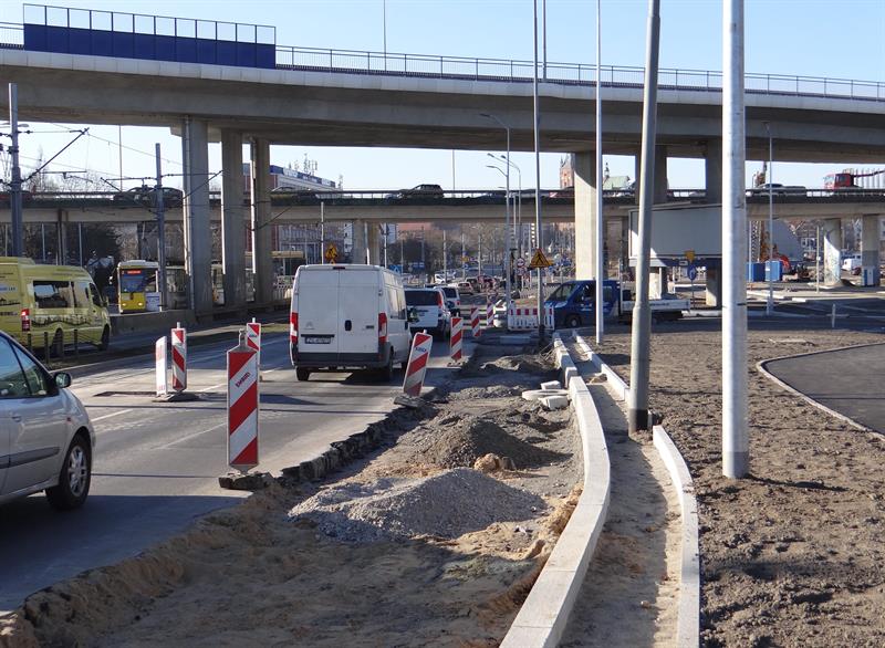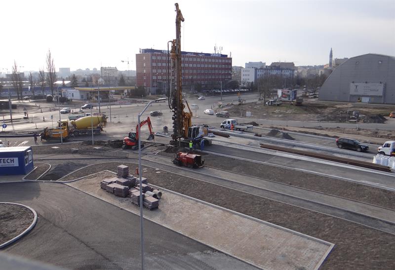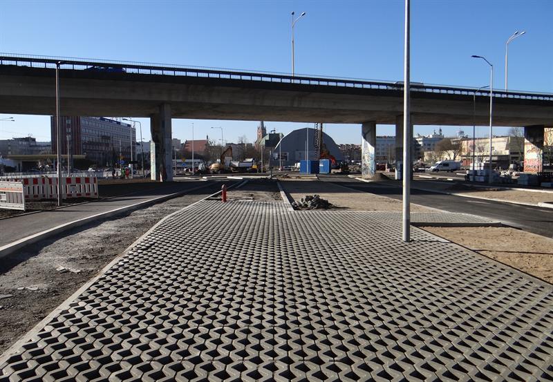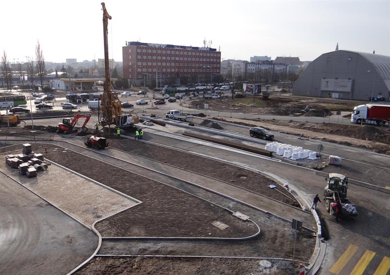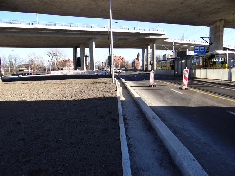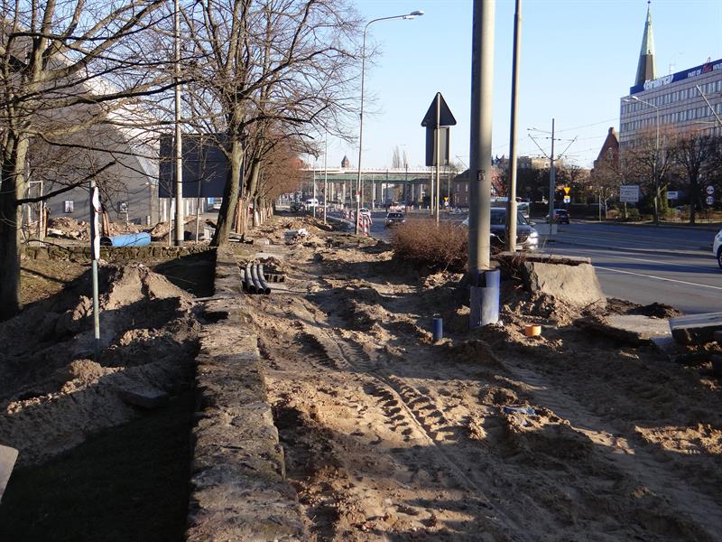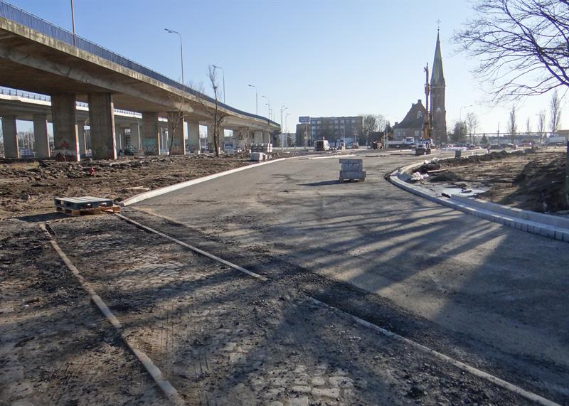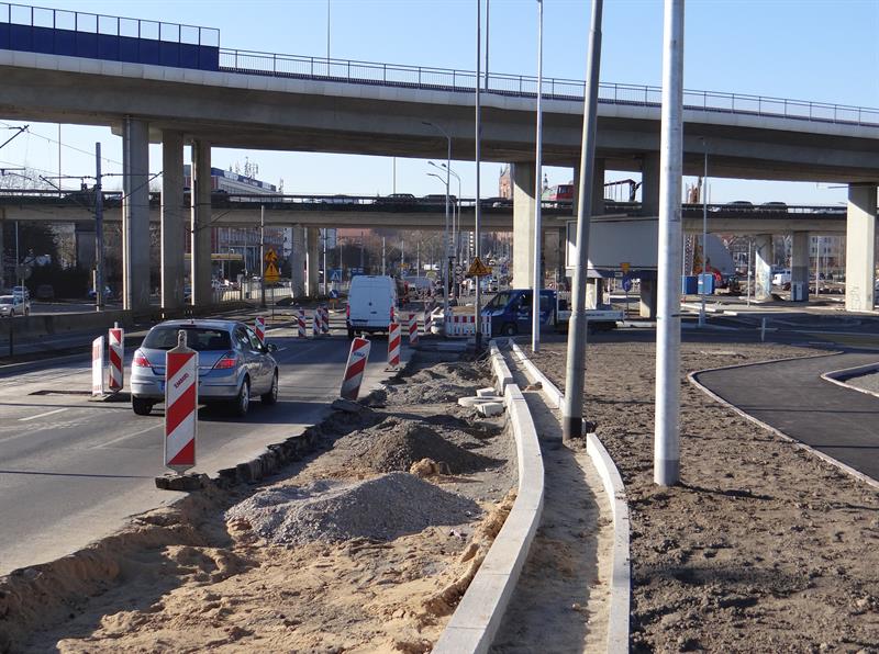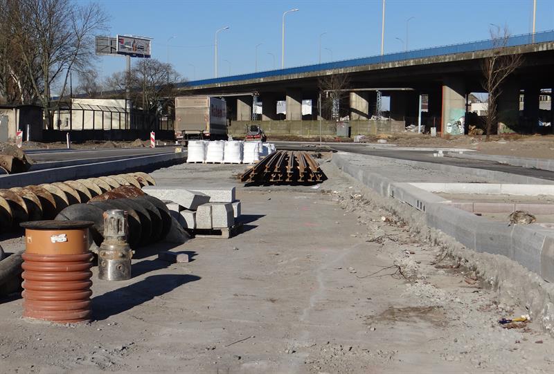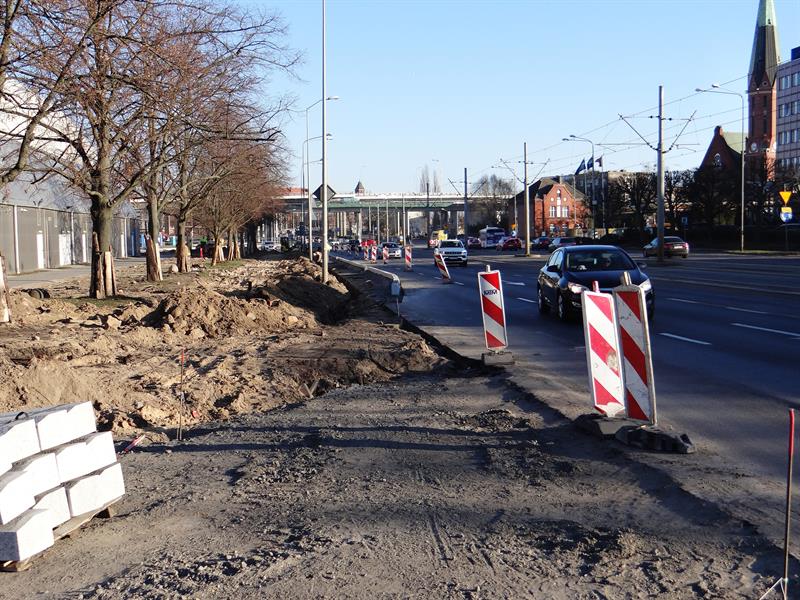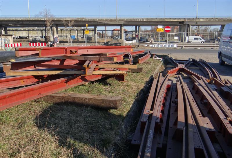Na plac budowy zwiezione też zostały szyny, krzyżownice i rozjazdy do montażu rozwidlenia torowiska z prawo- i lewoskrętami na wysokości skrzyżowania z ul. św. Floriana, odchodzącego z nowopowstającego ronda. Te będą początkiem odcinka nowej trasy dla tramwajów, które prowadzić ma dalej ul. Władysława IV do przyszłego nowego mostu Kłodnego nad Odrą Zachodnią, który połączy Łasztownię z lewobrzeżem. Teraz wykonywane są tam 32 odwierty przy użyciu specjalnego świdra pod podbudowy słupów trakcyjnych. W kolejnych kilkunastu podobnych wykopach posadowione zostaną podpory, do których mocowane będą później ekrany akustyczne. Te prace zajmą najbliższe dwa do trzech tygodni.