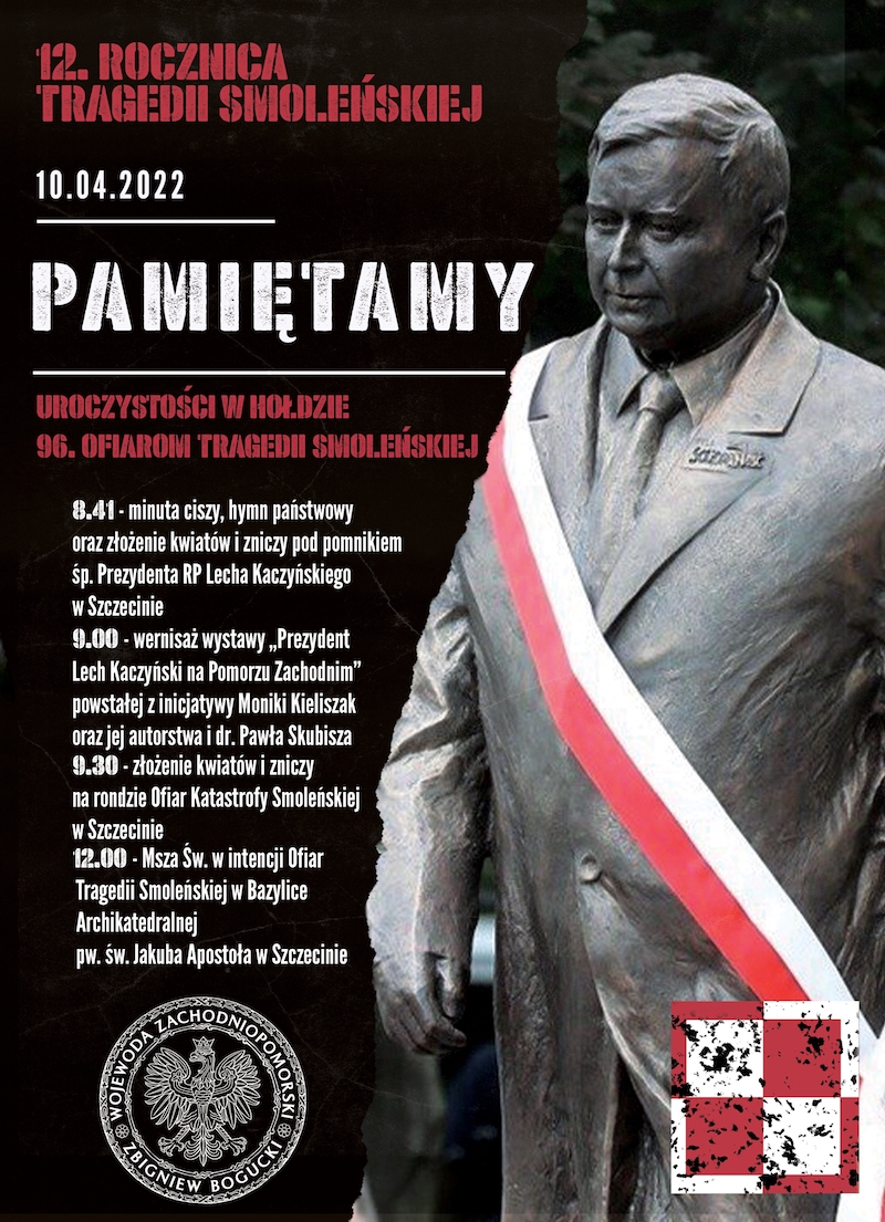 W niedzielę o g. 8.41 pod pomnikiem śp. Prezydenta RP Lecha Kaczyńskiego przy al. Wojska Polskiego 113 w Szczecinie rozpoczną się uroczystości w hołdzie dziewięćdziesięciu sześciu ofiarom katastrofy smoleńskiej. Po złożeniu kwiatów i zniczy pod pomnikiem będziemy mogli wziąć udział w wernisażu wystawy "Prezydent Lech Kaczyński na Pomorzu Zachodnim". Na g. 9.30 zaplanowano złożenie kwiatów i zniczy na rondzie Ofiar Katastrofy Smoleńskiej. O g. 12 w Bazylice Archikatedralnej pw. św. Jakuba Apostoła w Szczecinie rozpocznie się msza święta w intencji ofiar tragedii.