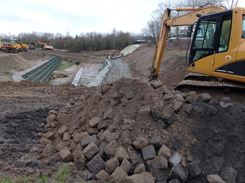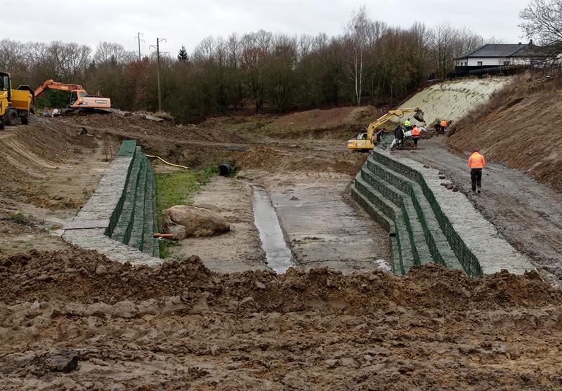 Wygląda to dość widowiskowo. Wysokie skarpy nasypów, mające po kilka stopni każdy o szerokości do 5 metrów, opasywane są szczelnie wykonanymi ze stali koszami gabionowymi. Te wypełniane są ręcznie warstwami brukowców. To ta najbardziej widoczna, ale nie jedyna część montowanych umocnień, które stanowić mają zabezpieczenie przed ich osuwaniem się.