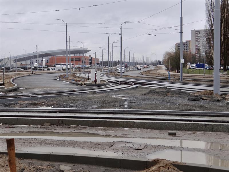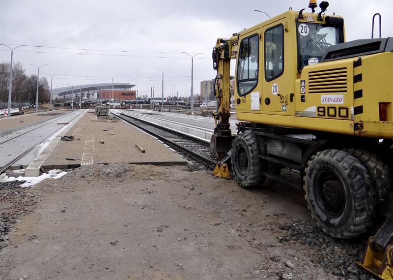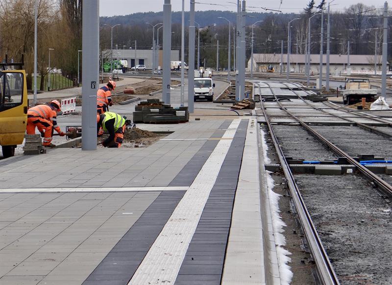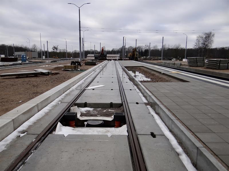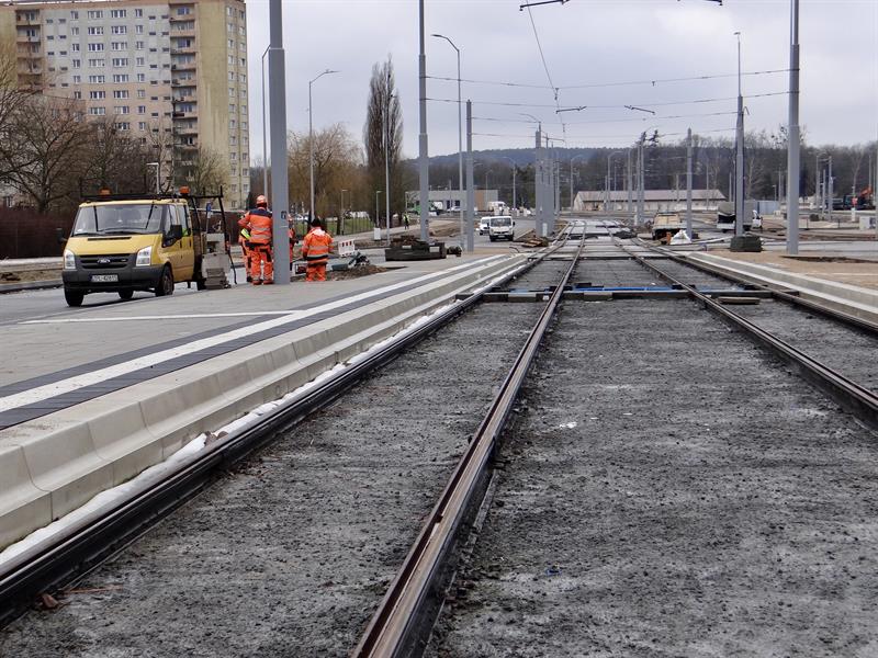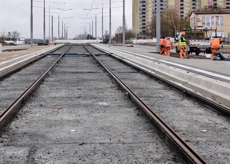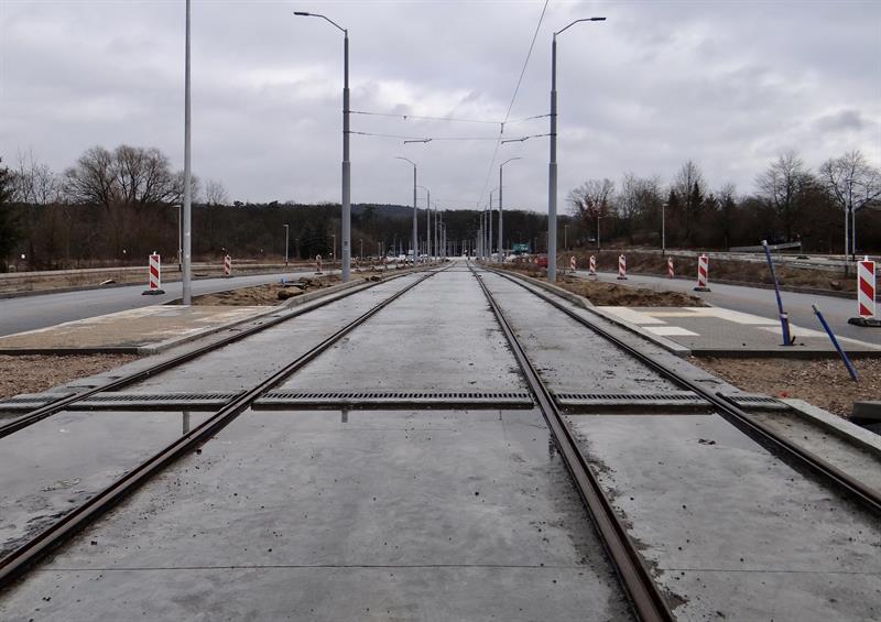 Zakończyły się już prace związane z układaniem toru w konstrukcji bezpodsypkowej i klasycznej wraz z rozjazdami oraz układaniem rozjazdów torów. W budynku nowej podstacji trwają prace wykończeniowe oraz montaż urządzeń elektroenergetycznych Gotowe jest także odwodnienie torowiska w konstrukcji podsypkowej. W znacznym stopniu zaawansowane są prace brukarskie (parkingi przy pętli, chodniki, perony na przystankach) oraz prace związane z wykonaniem konstrukcji jezdni.