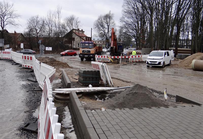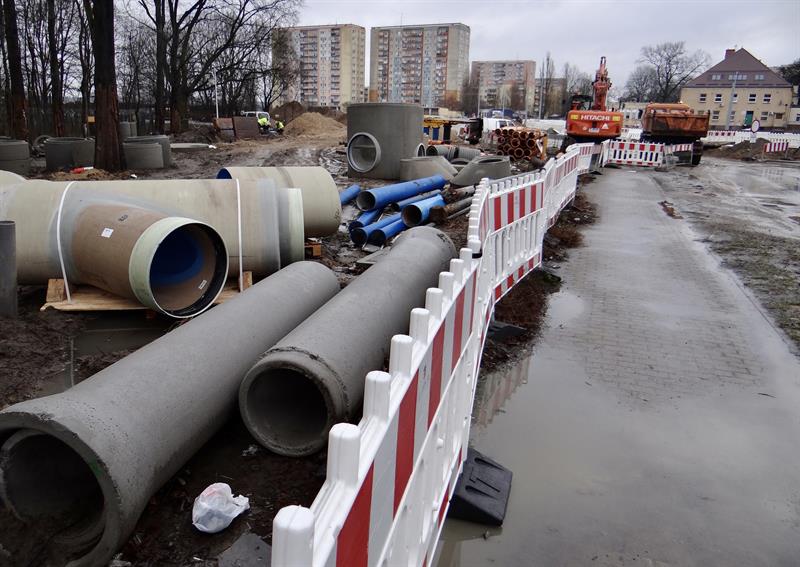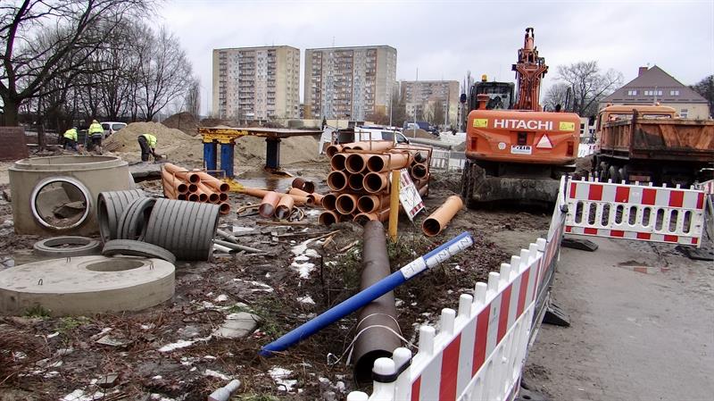 Za powstałym już nowym rondem z torowiskiem (pasy jezdni są jeszcze bez nawierzchni, ich wylewanie dopiero przed drogowcami) na wysokości skrzyżowania z ul. Eugeniusza Romera rozpocznie się wreszcie układanie odcinka kanalizacji deszczowej od istniejącego skrzyżowania ul. Szerokiej i ul. Modrej na długości ok. 80 m tej ostatniej. Zaprojektowana tam instalacja jest usytuowana w osi istniejącej drogi w związku z czym konieczne jest wykonanie tych prac tak, by całkowicie nie zamykać nią przejazdu. Stąd tymczasowo ruch wahadłowy. Dodatkowo wykonawca będzie prowadził roboty wodociągowe na tym odcinku oraz prace brukarskie i związane z wykonaniem nawierzchni jezdni.