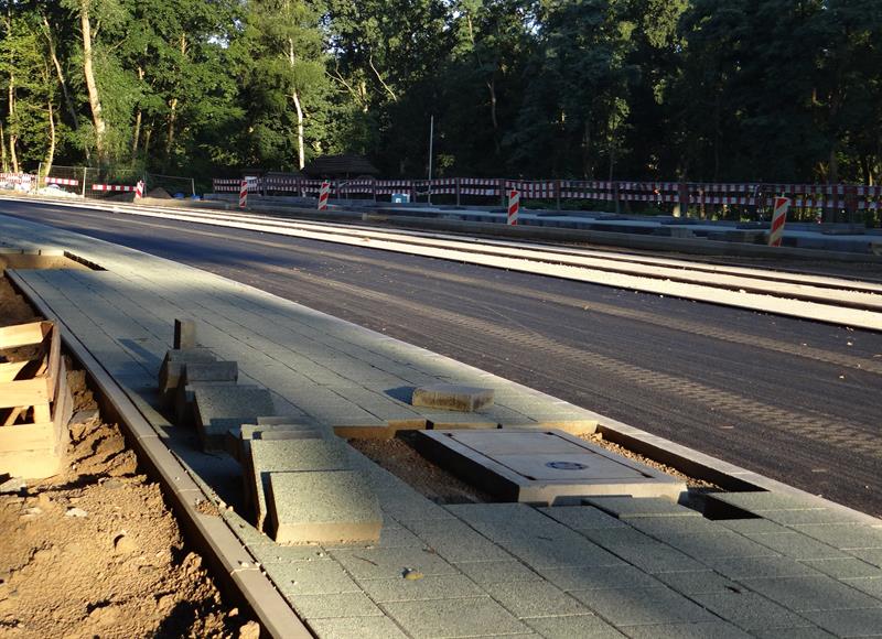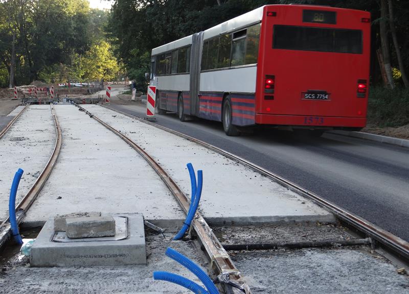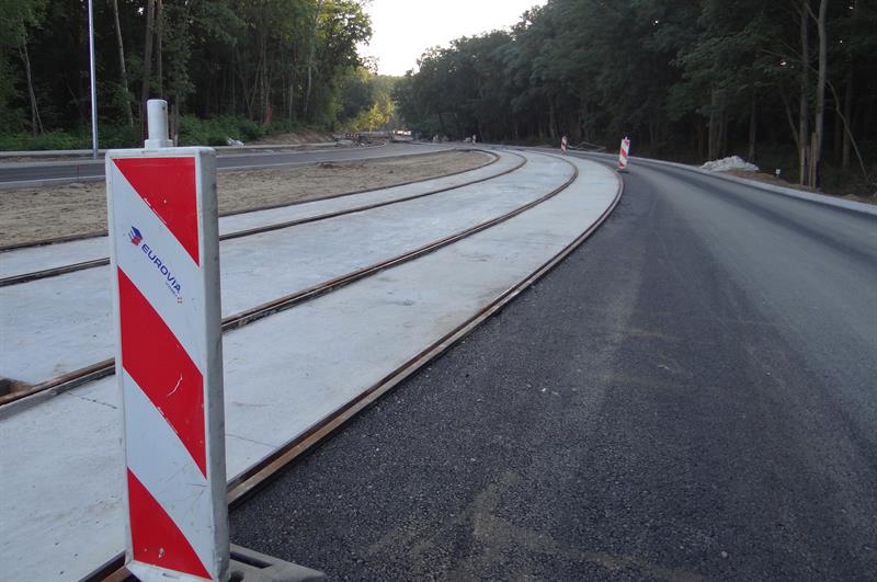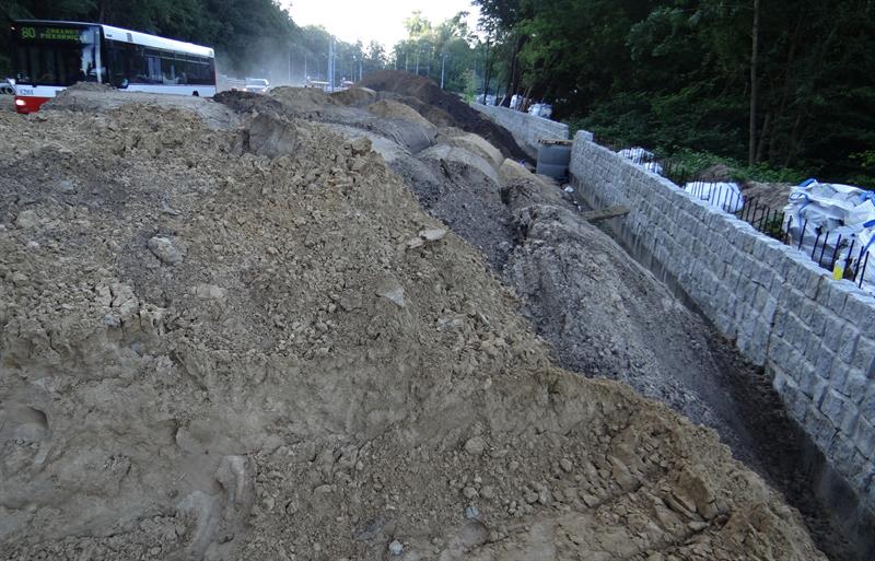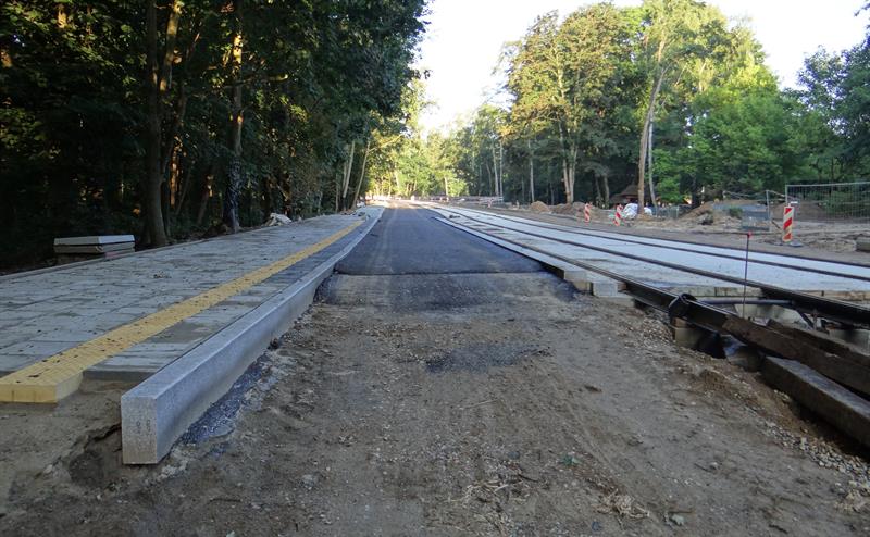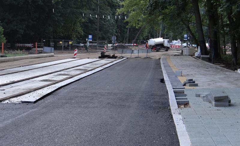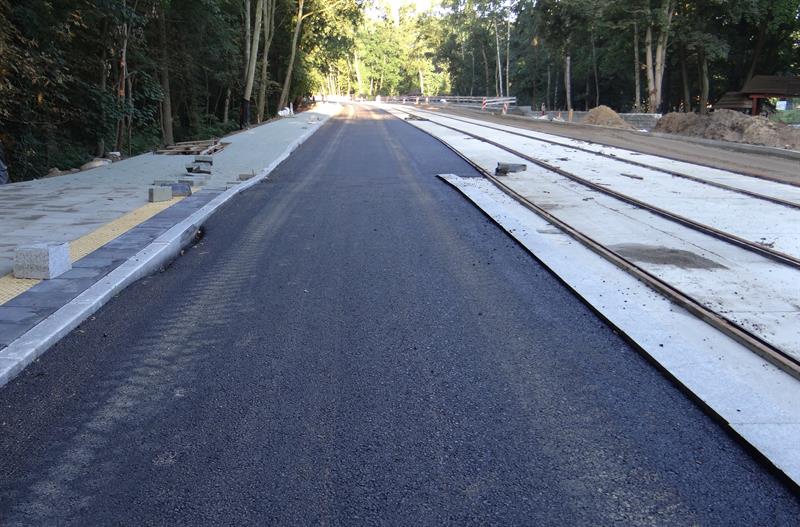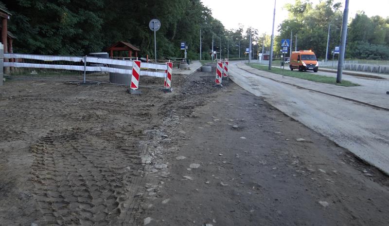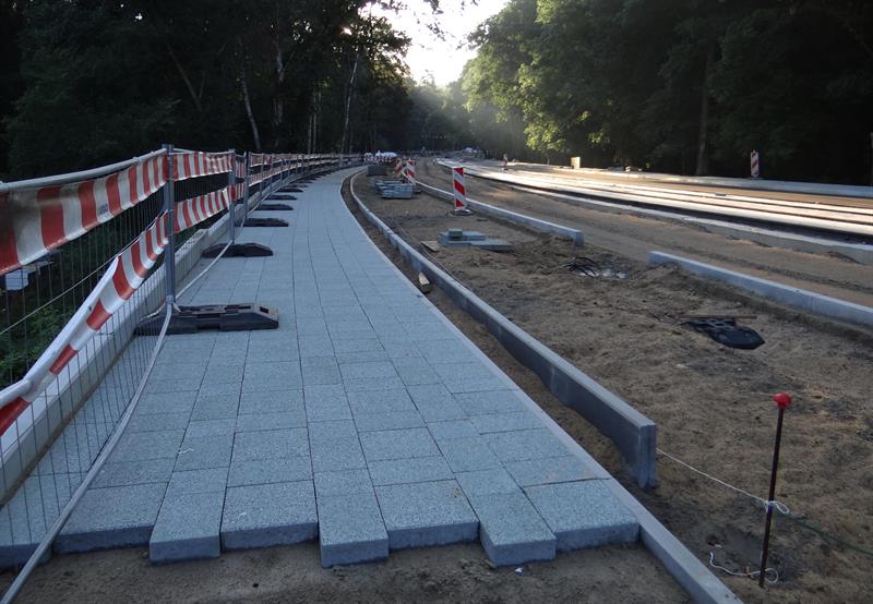Po obu stronach wytyczonej nowej jezdni prowadzone są roboty brukarskie przy układaniu chodników i wznoszeniu murków oporowych od strony Polany Czerwonej. Aż do miejsca starego przystanku 'Stadion Arkonia nż" (w kierunku pętli Las Arkoński), gdzie dostrzec można asfaltowe wyniesienie w pasie nowej jezdni między chodnikiem i torowiskiem. Tam urządzony będzie jeden z przystanków tzw. wiedeńskich.