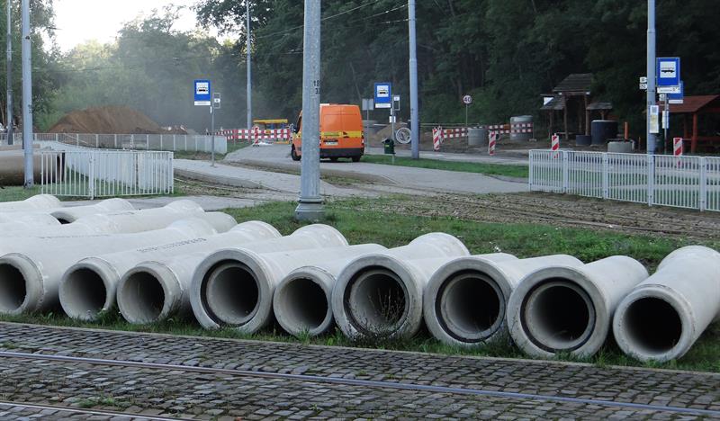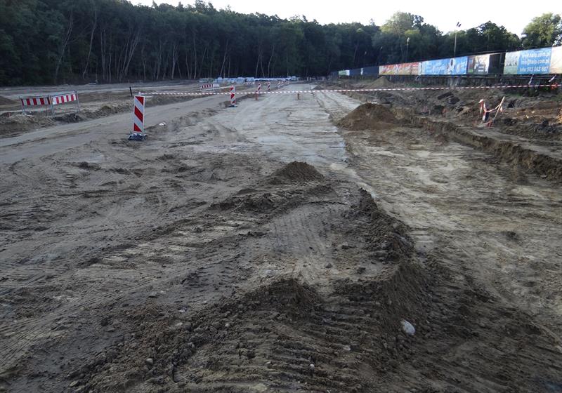 Od strony starej pętli tramwajów i w jej obręb zwieziona została i składowana jest część materiałów budowlanych, w tym rur budowanych nowych instalacji podziemnych, z kanalizacyjną włącznie. Wywrotki zwożą piach, a koparki, spychacze niwelują teren pod dalsze fragmenty nowej drogi wzdłuż stadionu do pętli. Przygotowywane jest równocześnie podłoże z warstwy kruszywa pod powstający naprzeciwko stadionu parking.