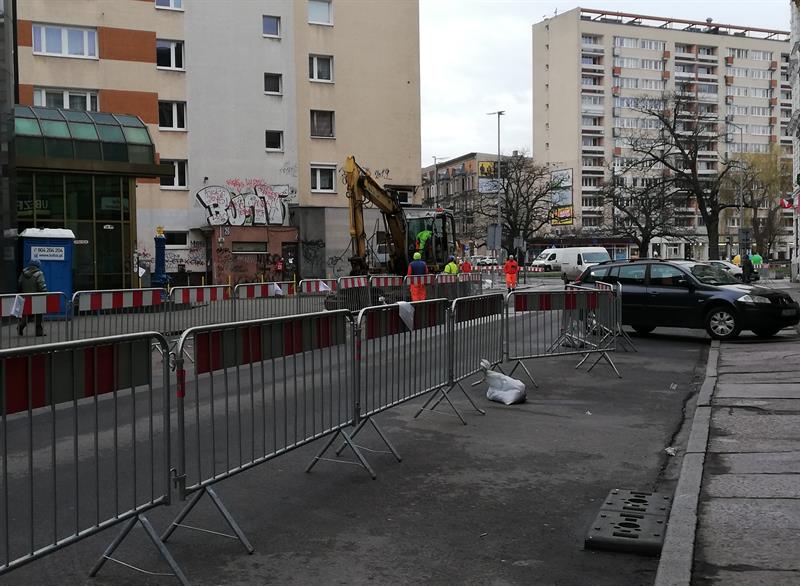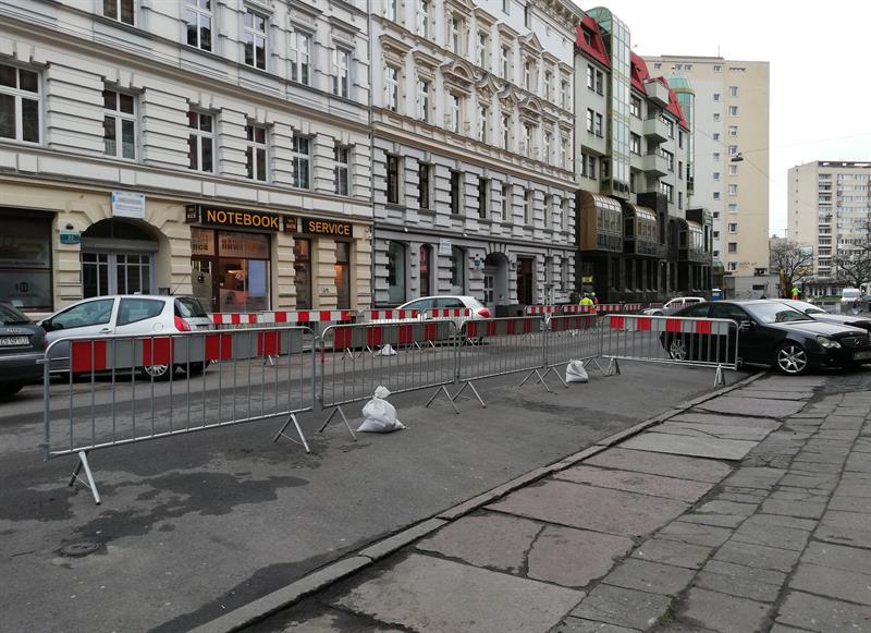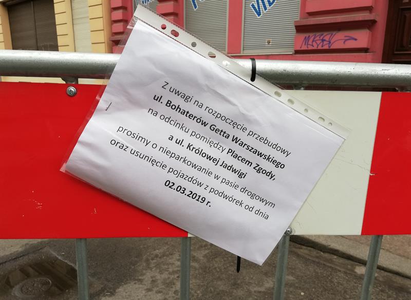 Spółka Elbud, której ZDiTM zlecił zadanie, do poniedziałku ustawiała wygrodzenia wzdłuż jezdni, informując o wprowadzanych utrudnieniach mieszkańców okolicznych budynków i przyjezdnych, rozwieszając stosowne komunikaty na bramach i barierkach, by nie parkowali w pasie drogowym, tj. po obu stronach jezdni na zamykanym dla ruchu samochodowego odcinku ul. Bohaterów Getta Warszawskiego. Spółka apeluje o usunięcie przez zainteresowanych swoich aut od 2 marca z okolicznych podwórek. W poniedziałek od rana trwał demontaż dotychczasowego stałego oznakowania, w tym znaków drogowych i słupów z tablicami z nazwami ulic, ustawiane było oznakowanie tymczasowe na czas inwestycji.