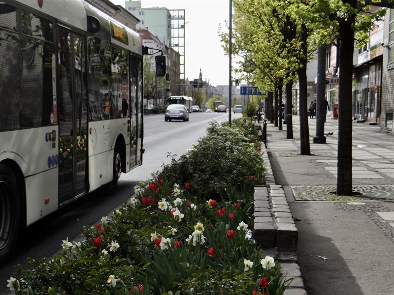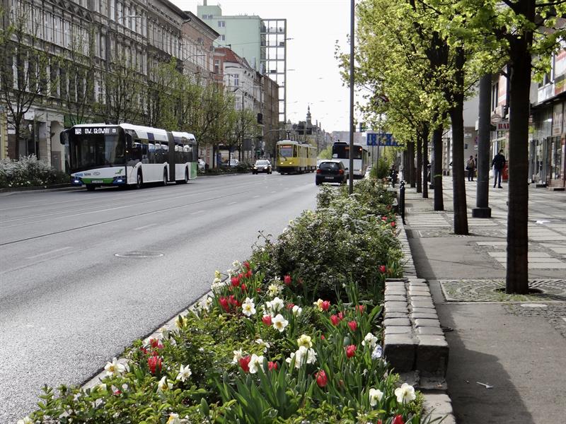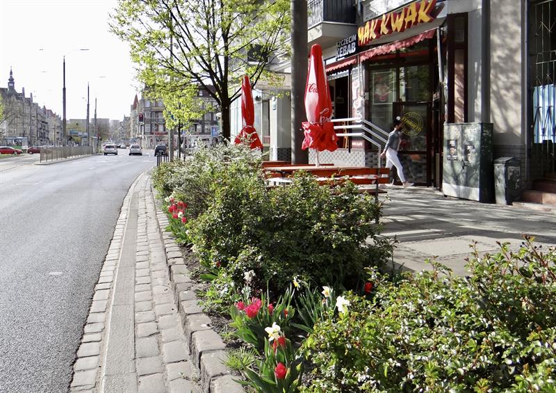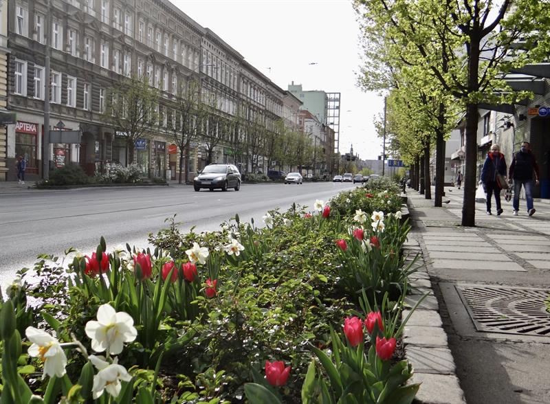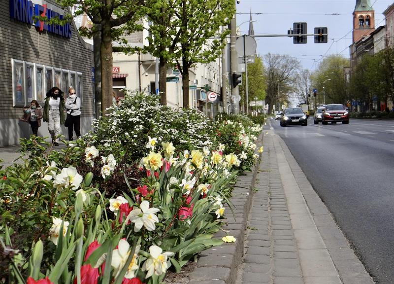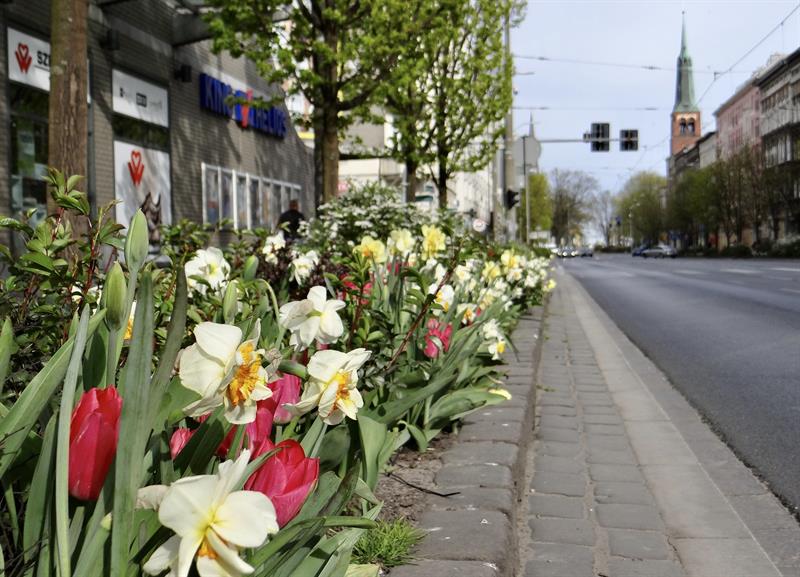 Ożyła nieco kolorami ul. Bolesława Krzywoustego w Szczecinie. Zazieleniły się rosnące wzdłuż niej w szpalerach drzewa. A na rabatach wśród lśniących zielenią krzewów róż i obsypanych teraz na biało tawuł rozkwitły narcyzy i tulipany. Widok miły dla oka nie tylko dla mieszkańców tego rejonu miasta przy okazji spaceru, wyjścia do sklepu po zakupy, ale i dla tych, którzy tędy jedynie są zazwyczaj przejazdem, pokonując ulicę własnym samochodem albo jak w przypadku pasażerów podczas jazdy autobusem czy tramwajem. ©℗