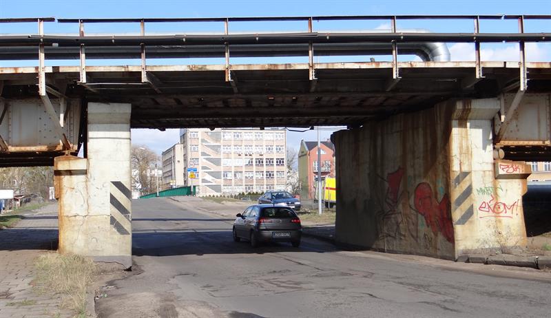 Na zdjęciu: Ulica Heyki. Na pierwszym planie biegnący nad nią most kolejowy, a w tle znajdujący się w bliskim jego sąsiedztwie sypiący się most drogowy nad Kanałem Zielonym.