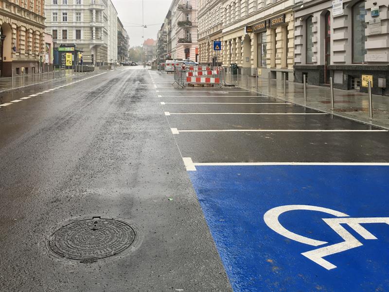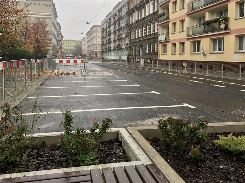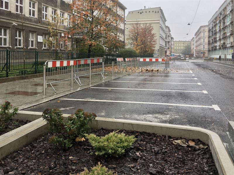 Wzdłuż każdej z ulic urządzane są zatoki postojowe do parkowania równoległego z jednej i prostopadłego z drugiej strony jezdni. W miejscach narażonych na nieprzepisowe parkowanie pojazdów wbudowywane są słupki zabezpieczające oraz ustawiane donice z białego betonu i z siedziskami z desek ze sztucznego drewna. Ponadto pojawią się stojaki rowerowe. ©℗