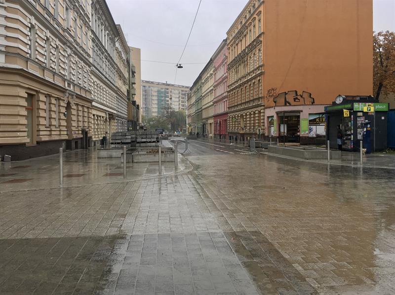 Przebudowywane są – wzorem sąsiednich dotąd zmodernizowanych ulic – skrzyżowania i rejony „sugerowanych” przejść dla pieszych. Krawężniki wykonywane są z wyniesieniem 2 cm zapewniającym prowadzenie wód opadowych. W rejonie skrzyżowań oraz „sugerowanych” przejść dla pieszych nawierzchnia układana jest z kostki granitowej szarej 15 x 15 x 15 cm. Nawierzchnia chodników zaś z płyt kamiennych o wymiarach 100 x 60 cm na styk, a opaski wzdłuż krawężnika i przy budynkach z kostki kamiennej szarej 10 x 10 x 10 cm.