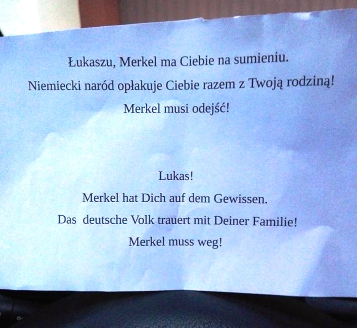 „Łukaszu, Merkel ma Ciebie na sumieniu. Niemiecki naród opłakuje Ciebie razem z Twoją rodziną! Merkel musi odejść!” – ulotki takiej treści rozdawane były kierowcom na przejściu granicznym w Lubieszynie.