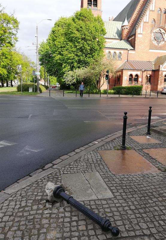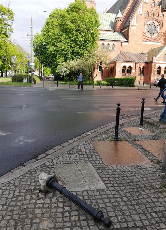 Żeliwne słupki u zbiegu ul. Krzywoustego oraz pl. Zwycięstwa zostały postawione, żeby uniemożliwić dzikie parkowanie na szerokim chodniku. Bo ograniczało przejście pieszym, innym kierowcom widoczność, a nade wszystko utrudniało życie mieszkańcom narożnej kamienicy (ul. Kopernika). Teraz jeden z tych słupków padł. Przypadek czy nie, ale w takim miejscu - co pewne - długo nie poleży. Lepiej, żeby miejskie służby w działaniu uprzedziły złomiarzy. Przynajmniej… szkoda będzie mniejsza.