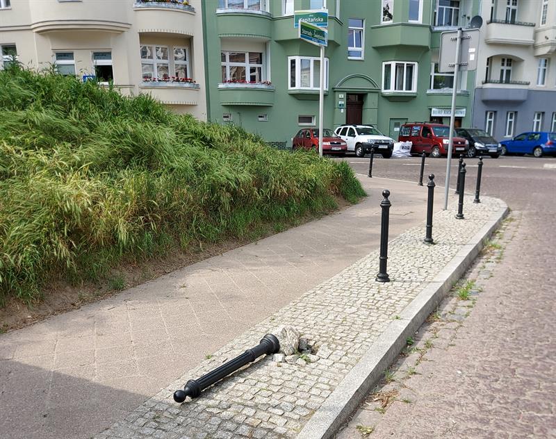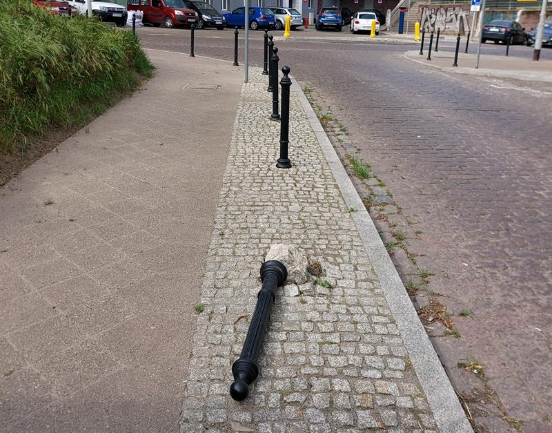 wyrwał słupek z chodnika i zostawił, znaleźć winnego przy pomocy monitoringu i do paki z nim tj. łobuzem.