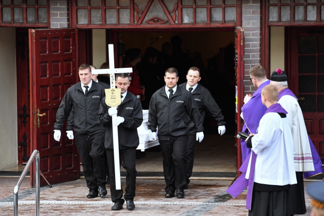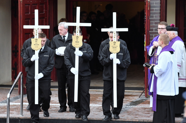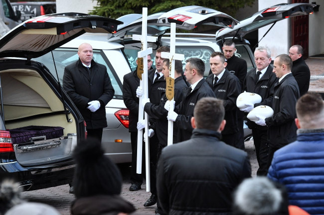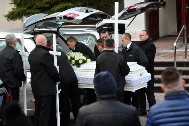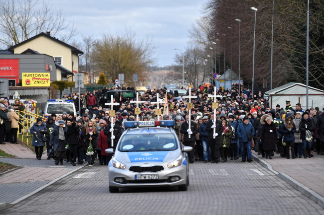 W czwartkowe (10 stycznia) przedpołudnie mieszkańcy gromadzili się wokół kościoła pw. Św. Kazimierza, gdzie odbyła się msza święta w intencji ofiar pożaru, w którym śmierć poniosło pięć 15-letnich gimnazjalistek. Tu rozpoczęły się uroczystości pogrzebowe, których finałem był pochówek na cmentarzu komunalnym.