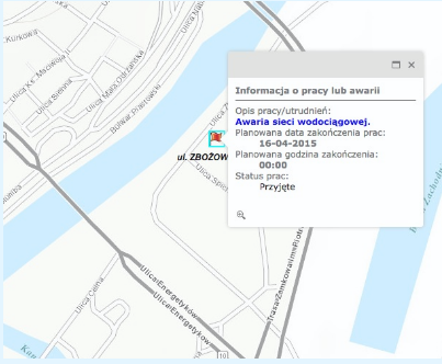 Po kliknięciu w te miejsca w specjalnym okienku wyświetla się informacja o rodzaju awarii lub charakterze prowadzonych prac i przewidywanym terminie ich zakończenia. Dwukrotne kliknięcie w dany obszar mapy powoduje jego częściowe przybliżenie. Do przybliżania i oddalania widoku służą również przyciski + i - umieszone w lewym górnym rogu mapy. Jeżeli po otwarciu mapy nie widać na niej żadnych flag, oznacza to, że w danej chwili nie ma żadnych wpisanych w system zgłoszeń.