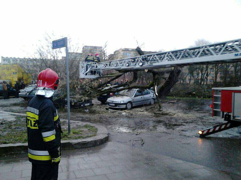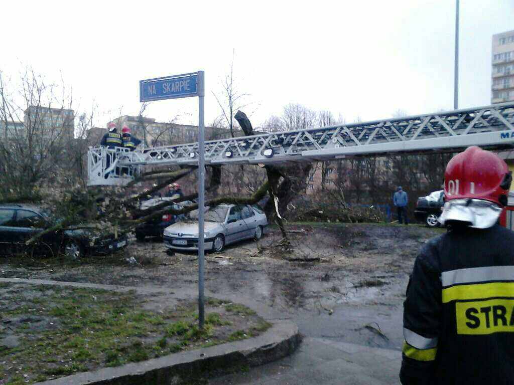 Przy ulicy Na Skarpie na szczecińskich Pomorzanach w sobotę wieczorem trwała akcja usuwania drzewa, które podczas wichury złamało się i przygniotło zaparkowane w pobliżu samochody. Przy pomocy specjalistycznego sprzętu strażacy usuwali przewrócony pień i połamane konary.