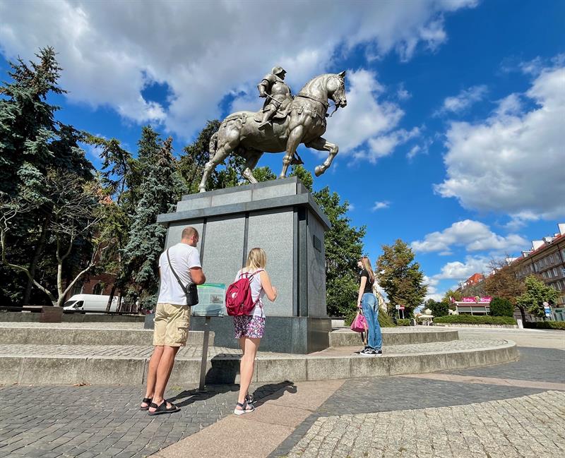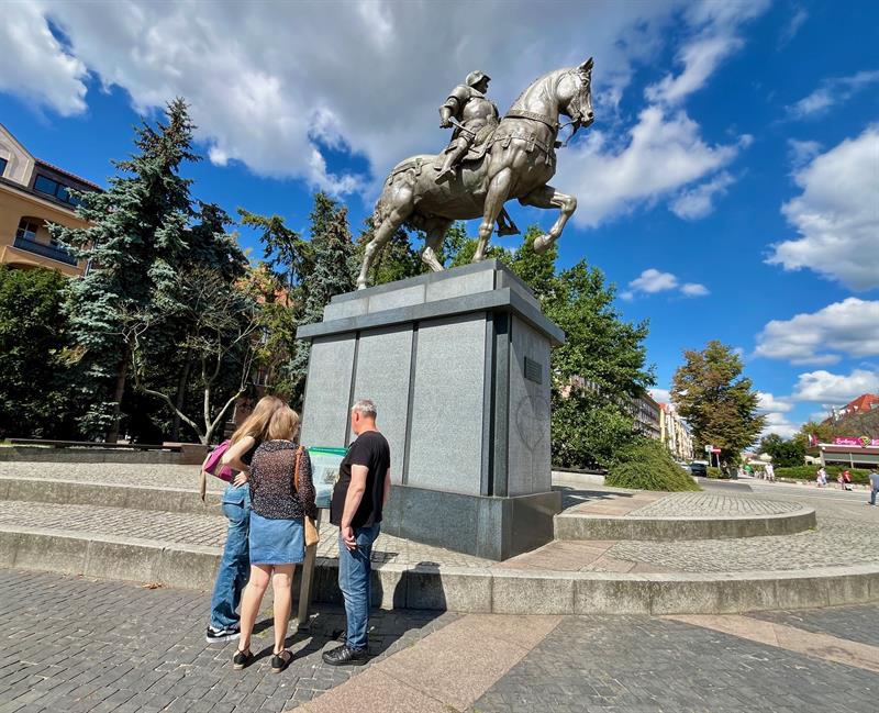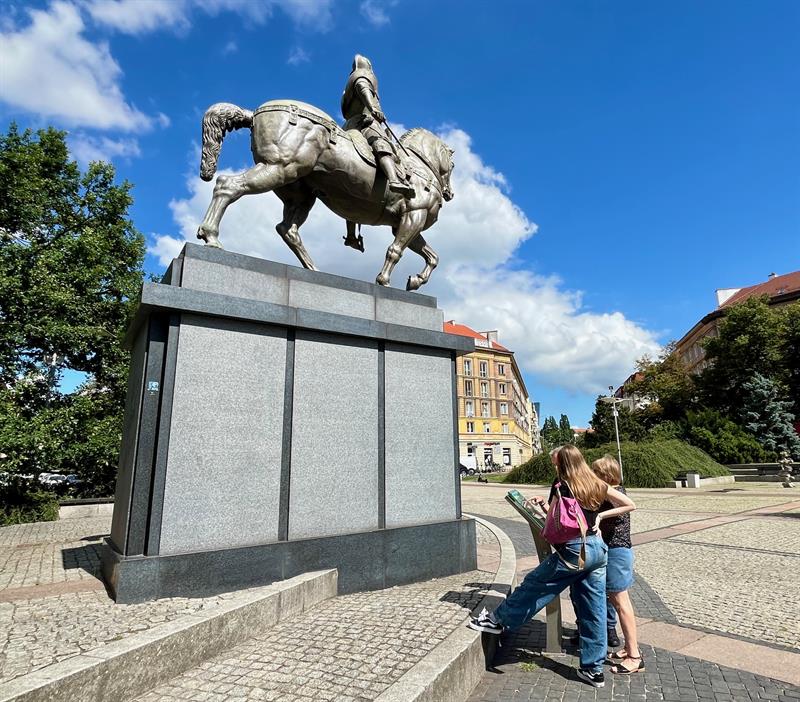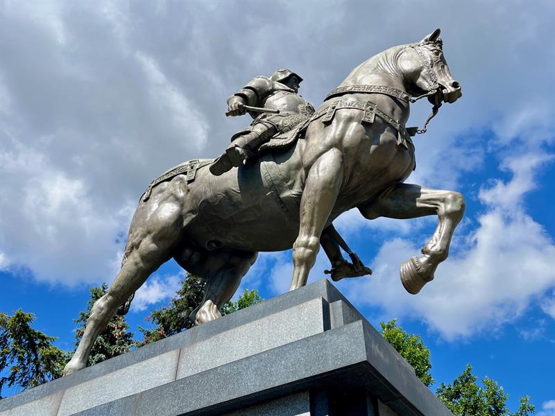 Ktoś uszkodził słynną kopię pomnika Colleoniego z placu Lotników. Zniknął fragment oręża trzymanego przez weneckiego kondotiera. Fot. Piotr SIKORA