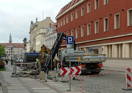 Przygotowania do nocnej akcji przełączeniowej widać już teraz w rejonie górnego tarasu Starego Miasta. Z ich powodu utrudnienia w ruchu pieszych oraz samochodów są m.in. na ul. Staromłyńskiej: wyłączenie odcinka chodnika, części miejsc parkingowych (także po stronie Wojewdzkiego Sądu Administracyjnego) oraz zwężenie jezdni.