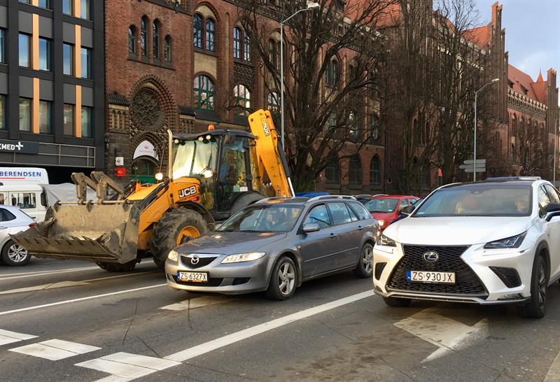 Bez rejestracji, a jednak mogą – choć nie bez ograniczeń – poruszać się nawet po centrach miast. Mowa o koparkach, spychaczach czy nawet ładowarkach (tzw. małe bobcaty), czyli o ciężkim sprzęcie budowlanym, który w Szczecinie nierzadko jest widywany także w godzinach szczytu komunikacyjnego i w punktach dla niego tak newralgicznych, jak choćby Brama Portowa czy pl. Żołnierza Polskiego.