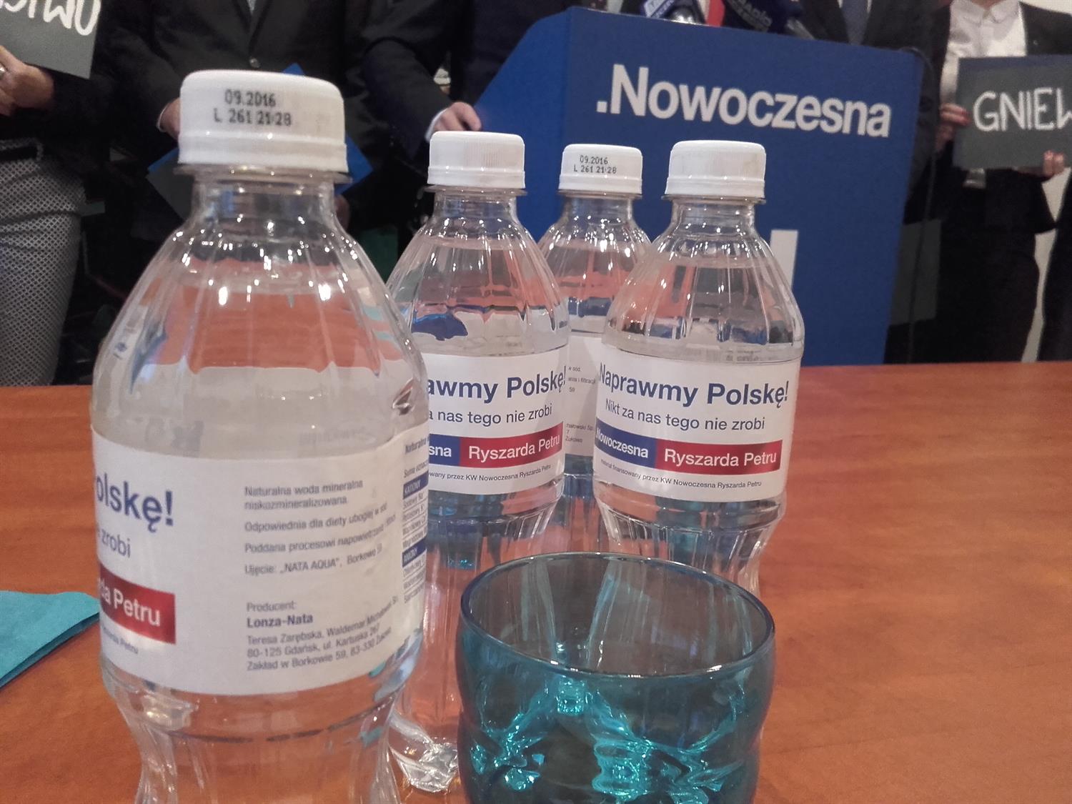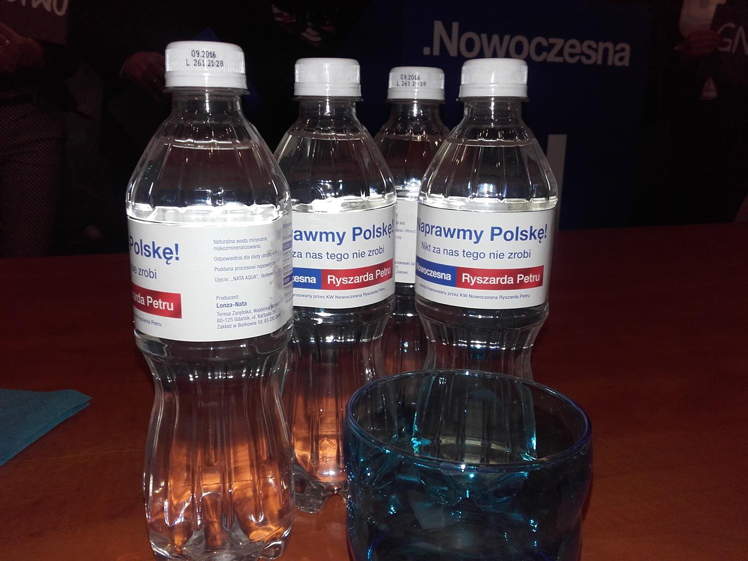 Jeśli ktoś trafi do biura posła Piotra Misiły na ulicy Pocztowej w Szczecinie musi wiedzieć o pewnej sprawie. Otóż butelki z wodą (sztuk osiem, sygnowane logo Nowoczesnej i nazwiskiem Ryszarda Petru), które stoją na stole konferencyjnym, są tylko... wystawą. Nie są do picia! I nie dajmy się zwieść kuszącym szklankom, które stoją obok butelek.
