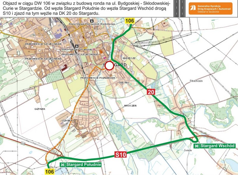 Organizacja ruchu podczas budowy ronda w centrum Stargardu będzie obejmowała zamknięcie przejazdu w kierunku ulic Kazimierza Wielkiego i Obwodnicy Staromiejskiej. Na skrzyżowaniu możliwy będzie przejazd z ul. Bydgoskiej w ul. Skłodowskiej-Curie. Dla tej relacji będzie obowiązywał ruch wahadłowy. Umożliwi to zwolnienie części terenu przyszłego ronda dla wykonywania robót. Zamknięcie wjazdu od strony ul. Obwodnica Staromiejska, czyli drogi wojewódzkiej 106, powoduje konieczność wprowadzenia objazdu dla tej drogi. Objazd został wyznaczony od węzła Stargard Południe (Kluczewo) na obwodnicę w ciągu S10 do węzła Stargard Wschód, gdzie należy zjechać na DK20 i przejechać przez przebudowywane skrzyżowanie od ul. Bydgoskiej.