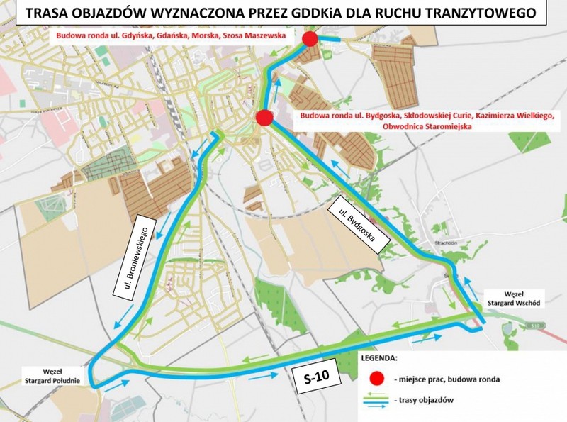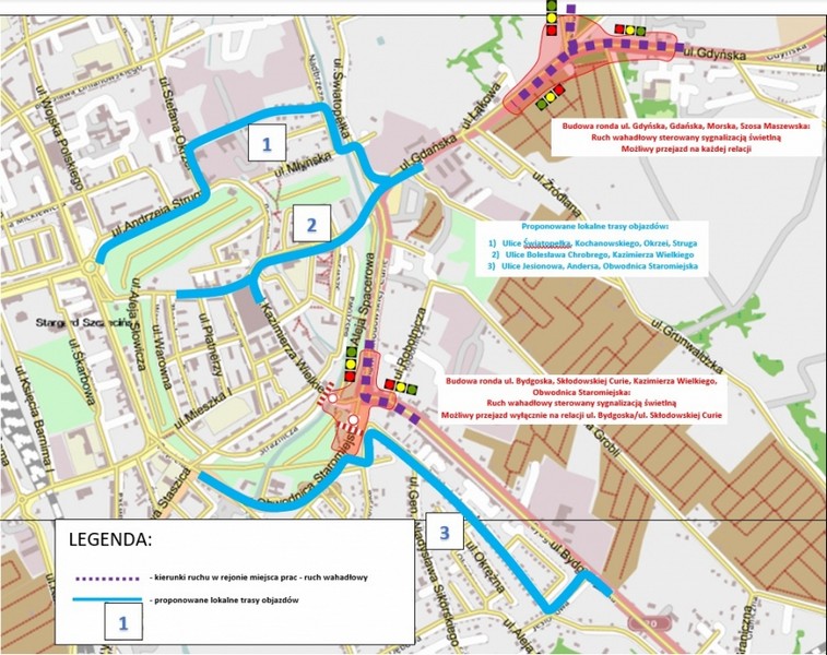 W kwietniu powinna zostać wprowadzona podstawowa organizacja ruchu na czas robót również na budowie drugiego ronda – na skrzyżowaniu ul. Gdańskiej, Gdyńskiej, Szosy Maszewskiej, Morskiej i Wiśniowej. Budowa rond w miejscu istniejących skrzyżowań będzie wiązała się z wprowadzeniem ruchu wahadłowego i zamknięciem niektórych relacji (skrzyżowanie z ul. Bydgoską) oraz objazdem w ciągu drogi wojewódzkiej nr 106. Te utrudnienia są konieczne po to, aby ronda mogły powstać. Zakończenie realizacji planuje się w październiku tego roku.