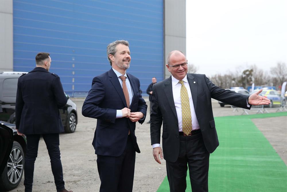 Króla Danii witali: prezes firmy Vestas Henrik Andersen, minister ds. klimatu, energii i usług użyteczności Lars Aagard, wiceminister infrastruktury Arkadiusz Marchewka, wiceminister rozwoju i technologii Ignacy Niemczycki, oraz dyrektor generalny Duńskiej Izby Handlowej Brian Mikkelsen.