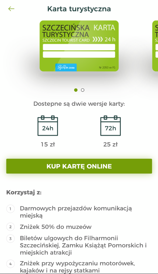 Wśród nowych funkcjonalności znalazły się m.in. możliwość kupna elektronicznej Szczecińskiej Karty Turystycznej uprawniającej do wielu zniżek m.in. w restauracjach, teatrach i muzeach. Jej posiadacze mogą również bez dodatkowych opłat poruszać się komunikacją miejską. Karta sprzedawana jest w dwóch wersjach – 24- i 72-godzinnej w cenach 15 i 25 zł. Kolejną nowością oferowaną przez Visit Szczecin jest możliwość skorzystania z turystycznej infolinii. Po wybraniu odpowiedniej opcji telefon sam połączy się z numerem miejskiego Centrum Informacji Turystycznej. Prócz tego aplikacja powie nam, jaka pogoda prognozowana jest w Szczecinie i sprawnie odeśle zainteresowanych użytkowników do rozkładów jazdy komunikacji miejskiej opublikowanych na stronie ZDiTM. Dzięki programowi poznamy także harmonogram i opisy wydarzeń, które odbędą się w Szczecinie w najbliższym czasie.