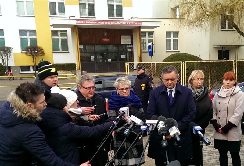 W poniedziałek nie było zajęć lekcyjnych w Gimnazjum nr 9, które wchodzi w skład Szkoły Podstawowej nr 18, ale spotkania młodzieży trzeciej klasy i nauczycielami z przedstawicielami poradni psychologiczno-pedagogicznej. Dyrektor Karina Gajda twierdzi, że to trudne dni dla wszystkich. Przybyła do Koszalina Magdalena Zarębska-Kulesza, zachodniopomorski kurator oświaty, zachęcała licznych dziennikarzy do wstrzemięźliwości w kontaktach z gimnazjalistami, którzy rano odkryli pięć pustych miejsc w klasie.