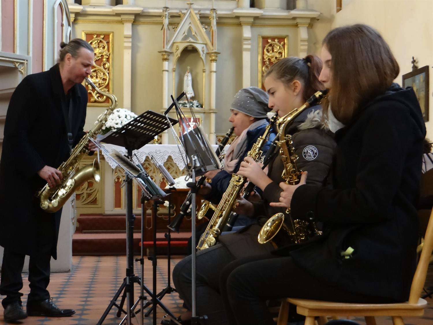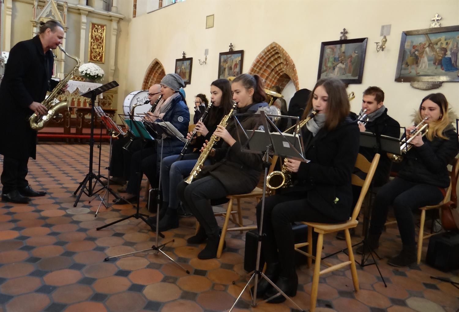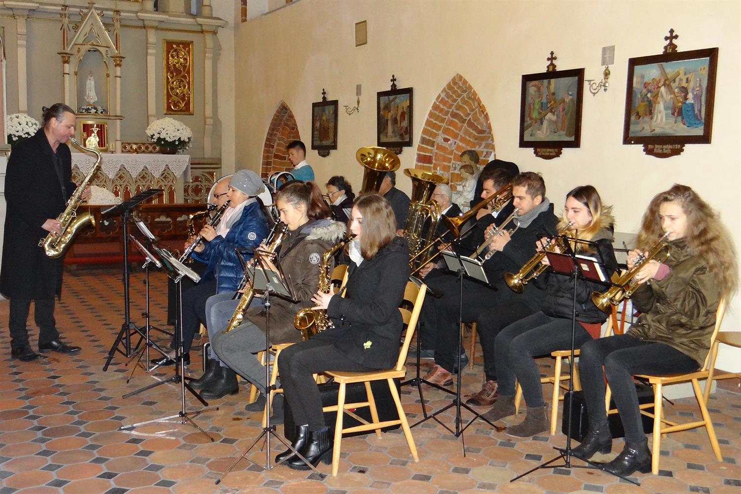 Wcześniej w kościele Wniebowzięcia Najświętszej Marii Panny zebranym zaprezentowali się muzycy z Młodzieżowej Orkiestry Dętej, działającej przy MOK w Dąbiu, pod dyrekcją Macieja Strycharczyka, klarnecisty i saksofonisty. W ich wykonaniu i interpretacjach zebrani wysłuchali pieśni marszowych i patriotycznych.